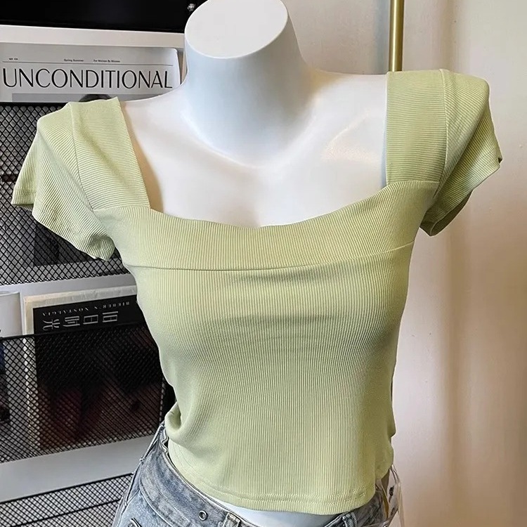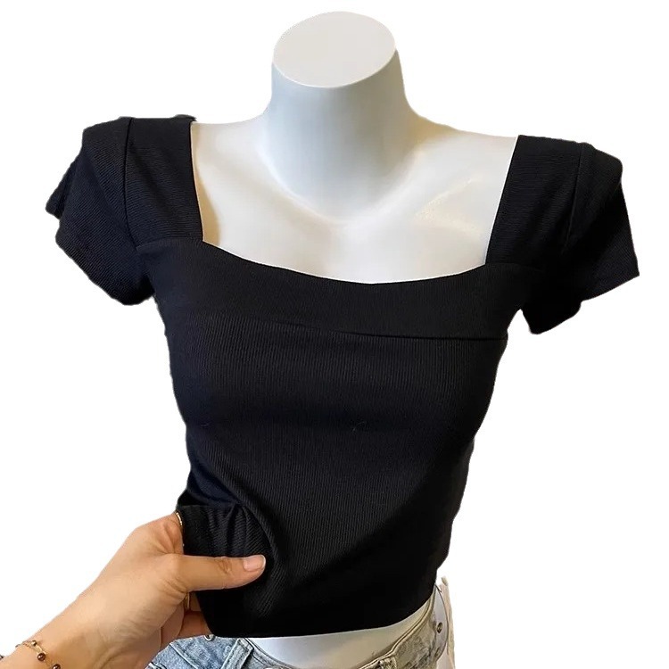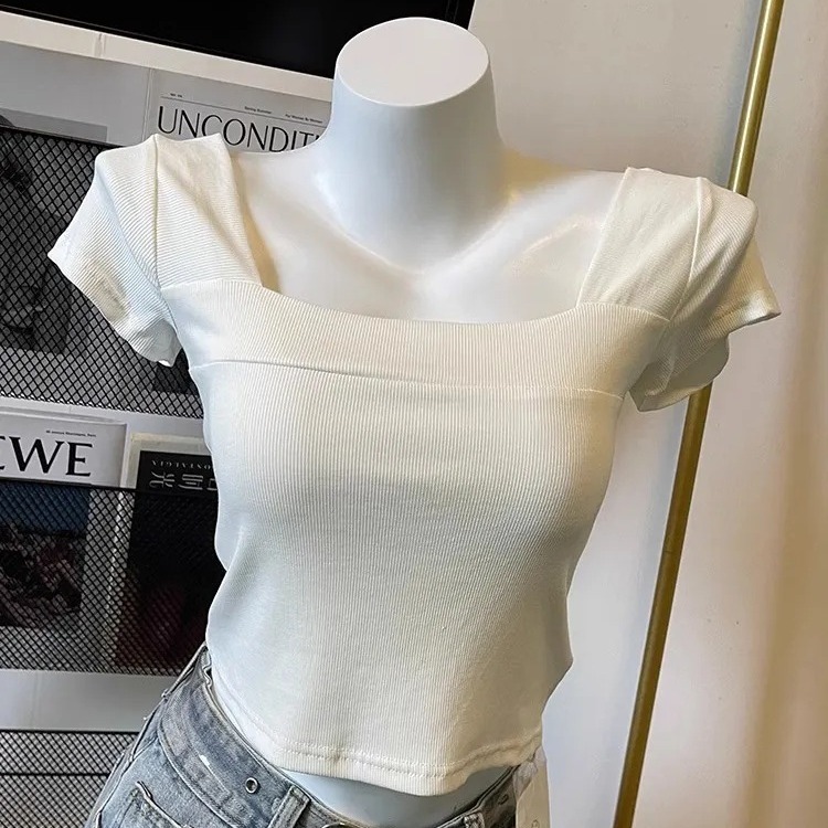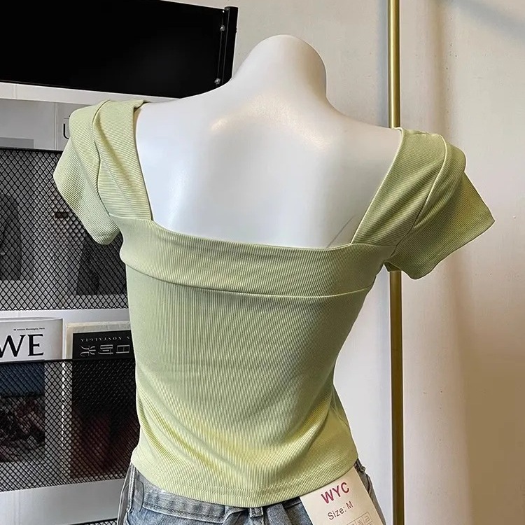 奥特莱斯~撤柜清仓方领正肩短袖t恤女收腰显瘦夏季韩系短款上衣潮