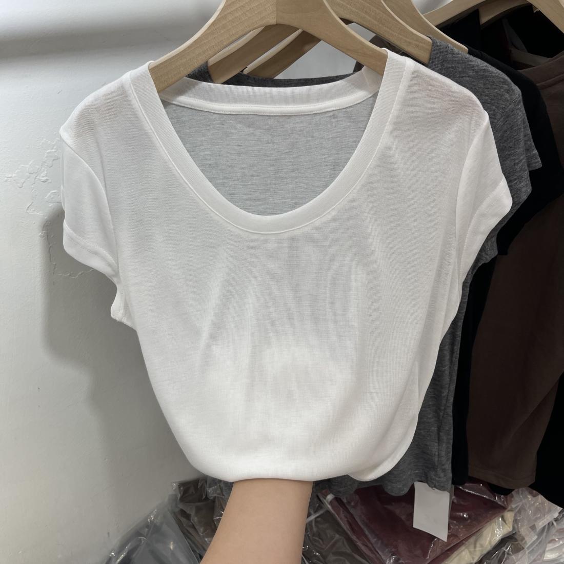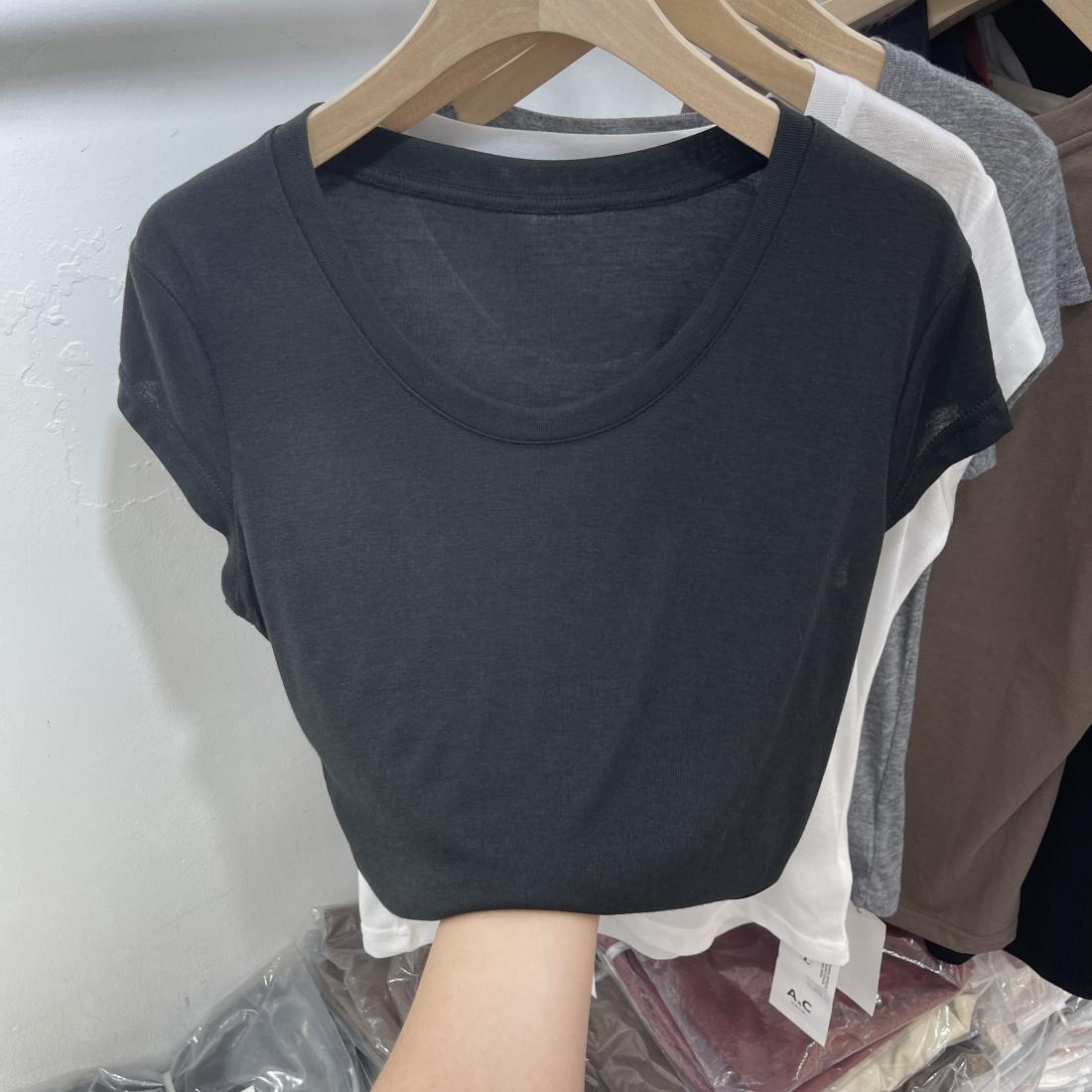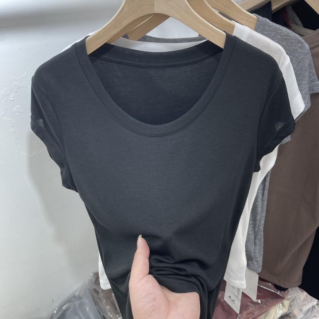 超手感短款莫代尔t恤女小众夏季修身显瘦圆领短袖纯色打底衫
