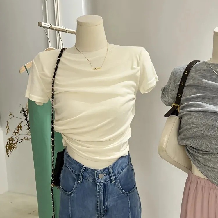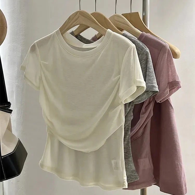 莫代尔纯欲风粉色t恤女夏薄款设计感褶皱不规则短款修身短袖上衣