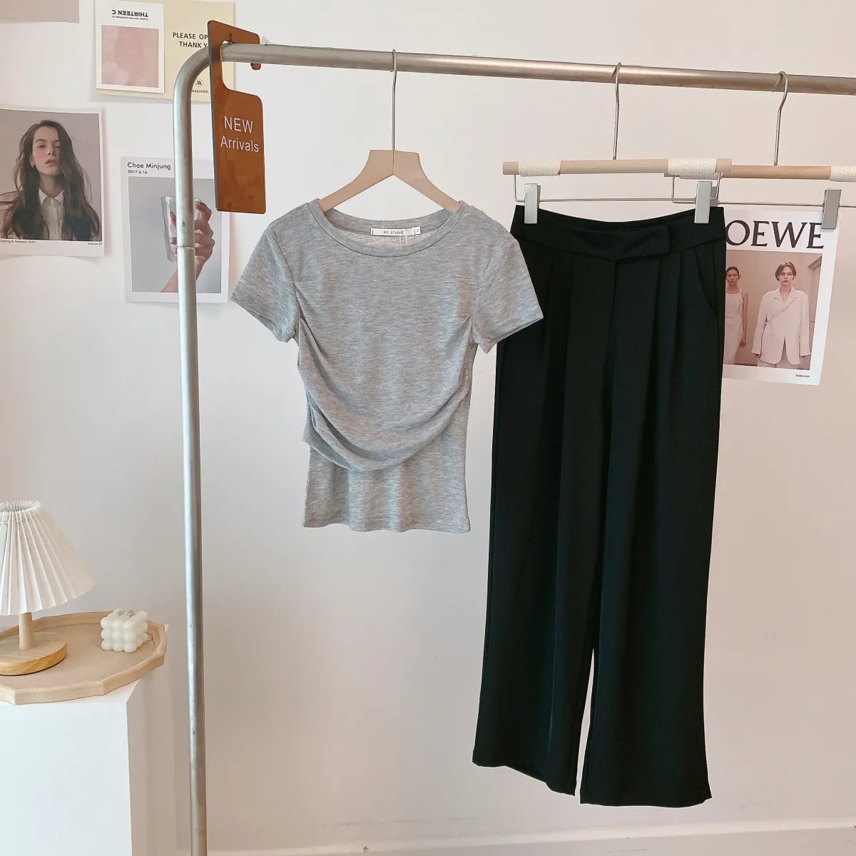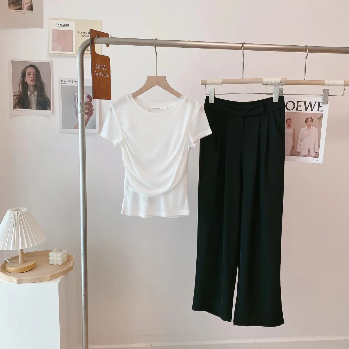 高档【夏日浪漫】压褶微透T恤夏季设计感修身显瘦短袖上衣女