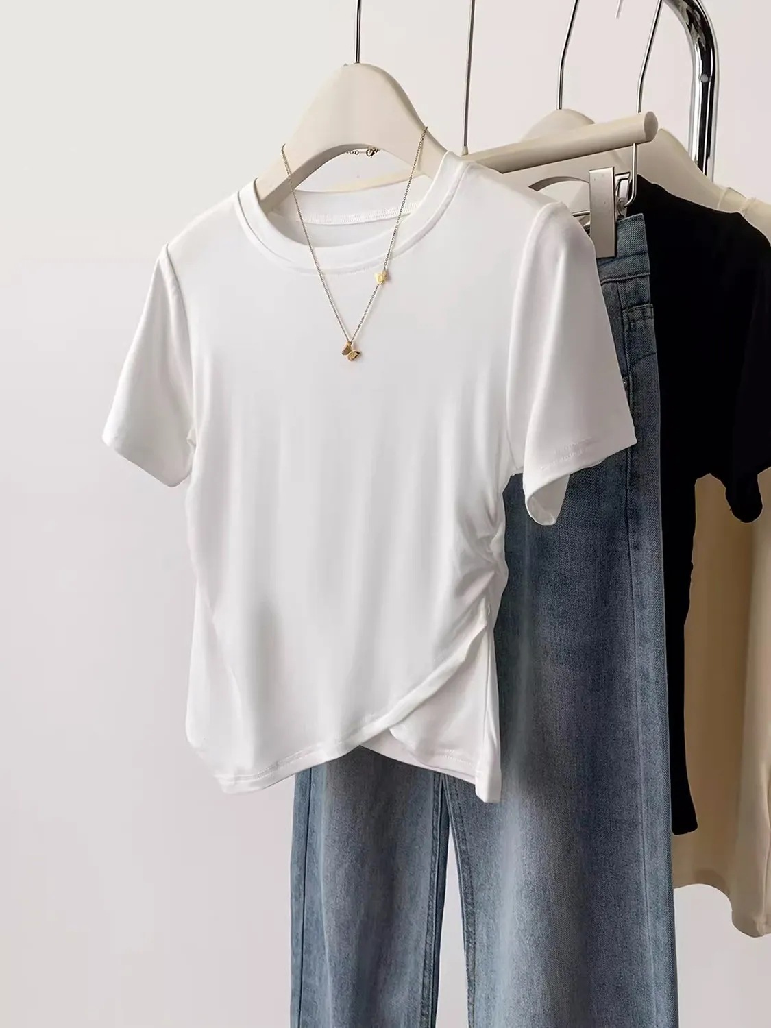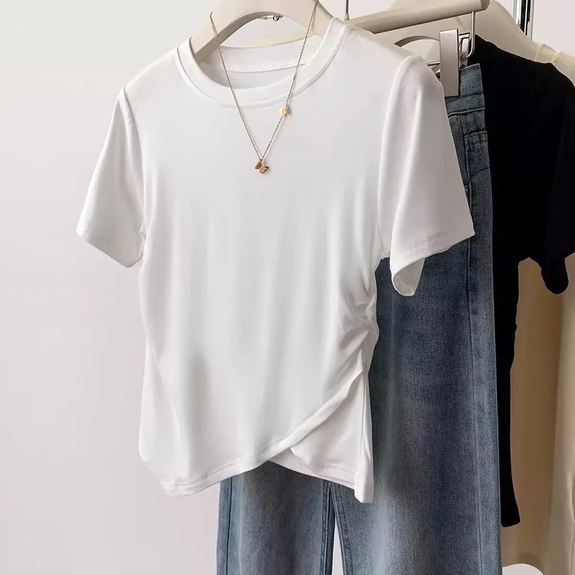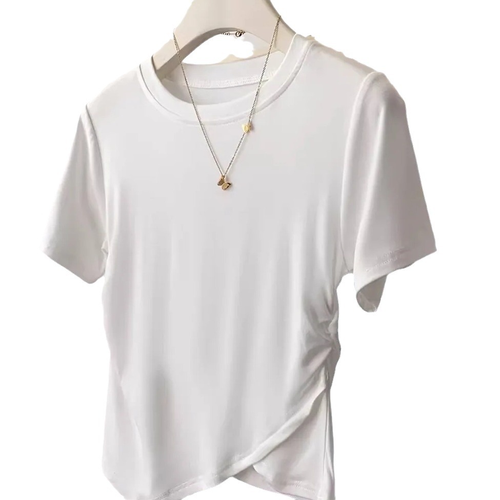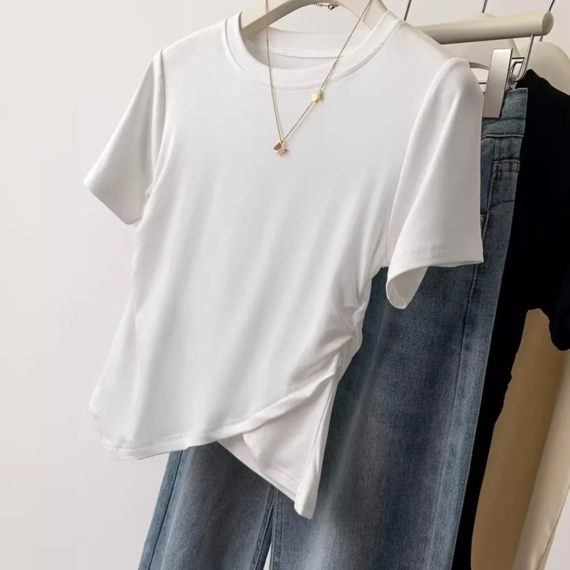 高端女装褶皱上衣小心机下摆侧开叉不规则别致设计感短袖T恤女夏