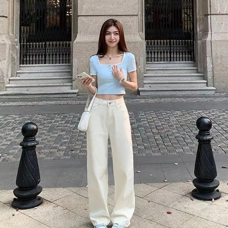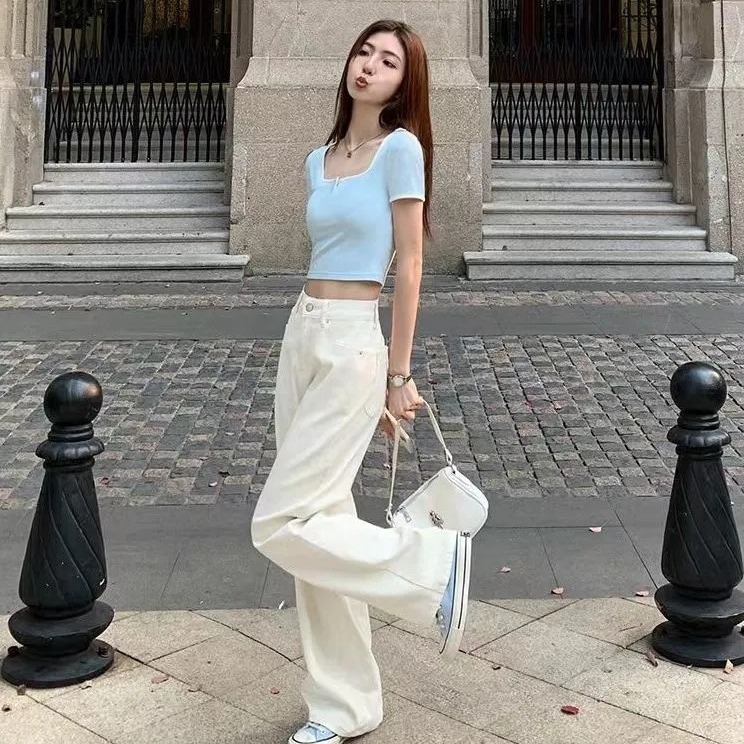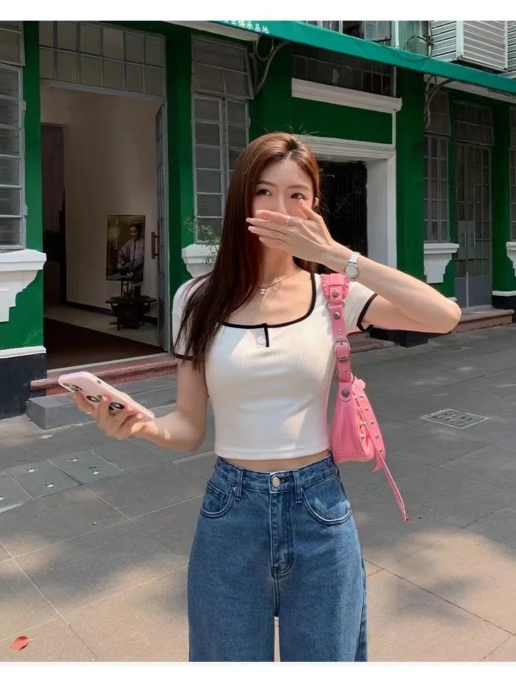 韩系甜妹!!!【基础款正肩】短袖T恤女INS韩版U领简约风短款上衣服