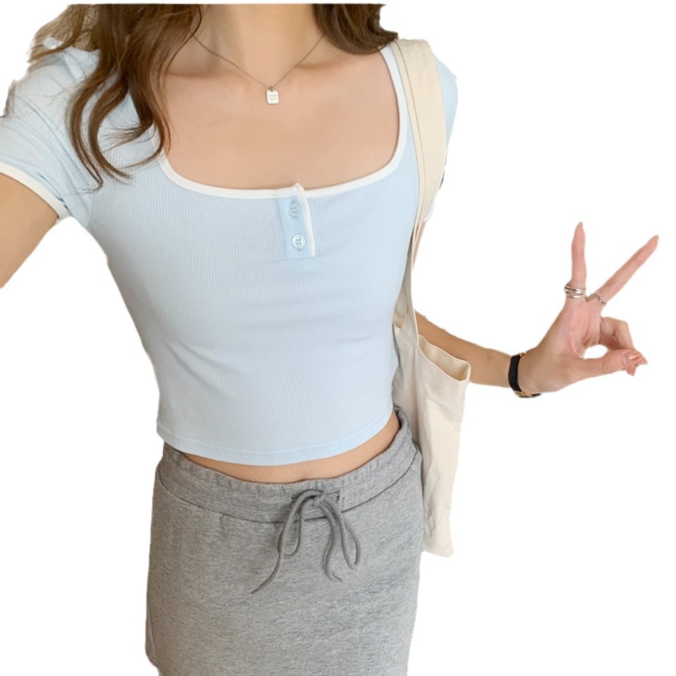 撞色方领短袖t恤女夏季新款小众设计感修身短款高腰露脐上衣