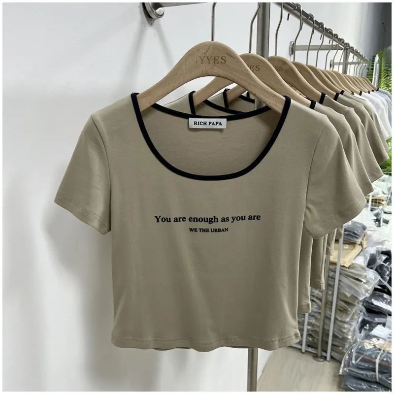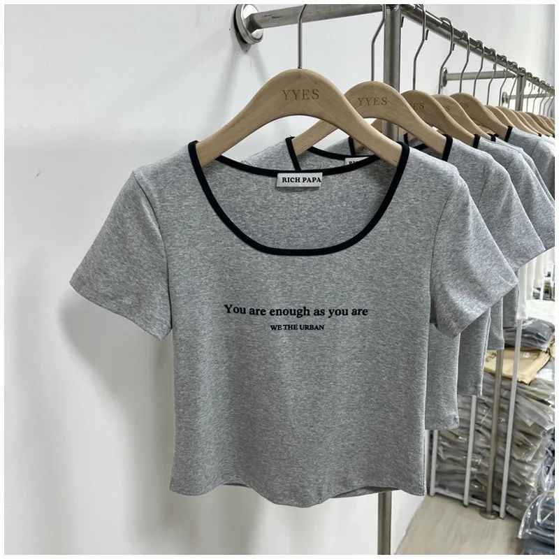 高档美式方领气质印花短袖t恤女夏季韩版新款短款打底衫上衣衫潮