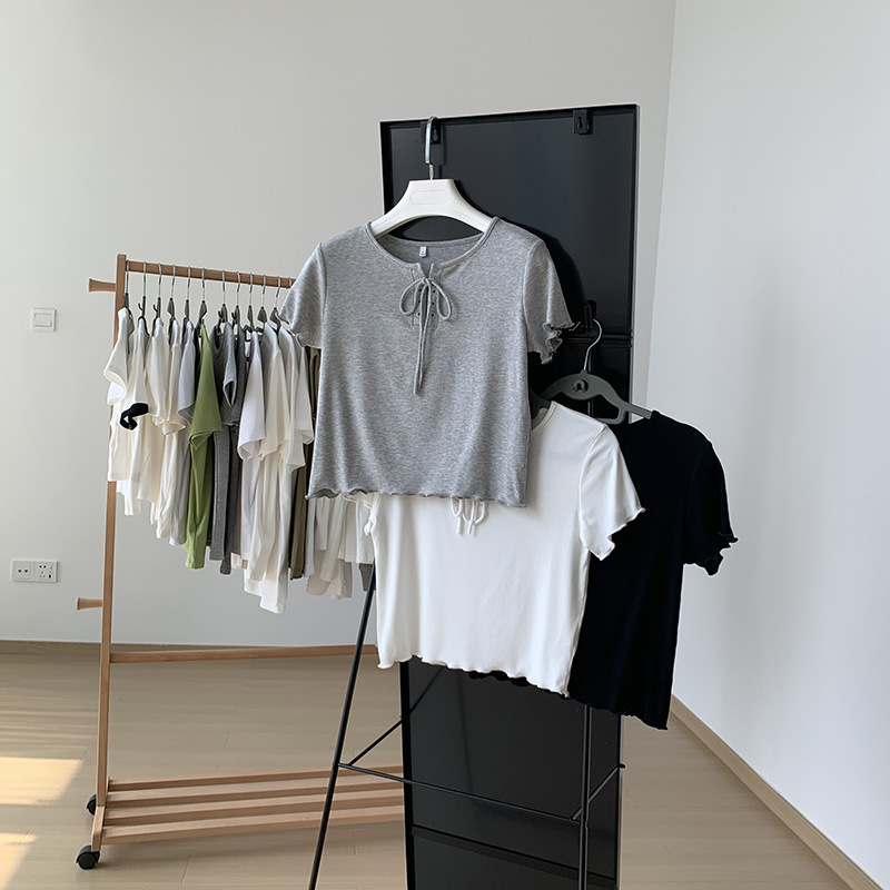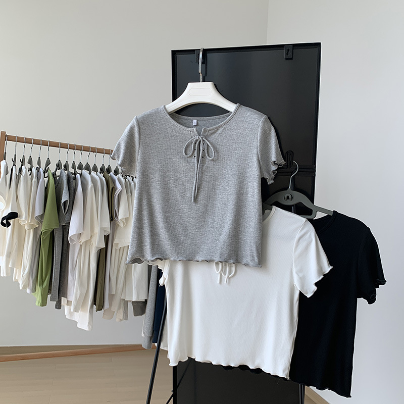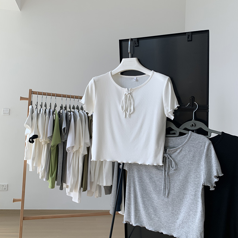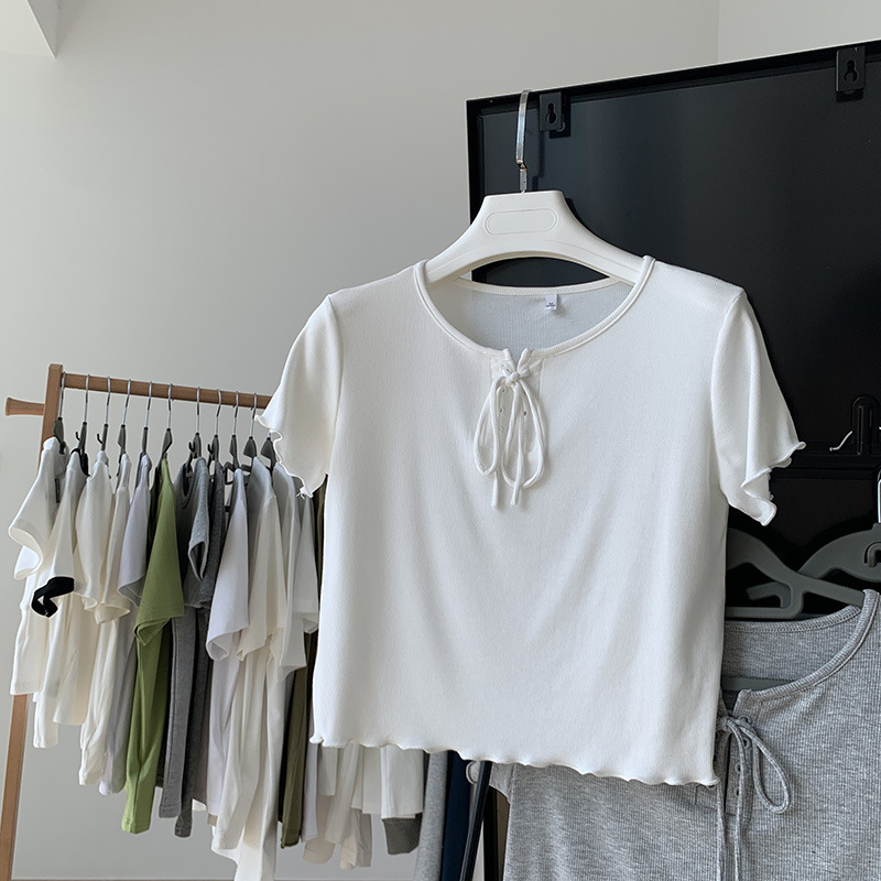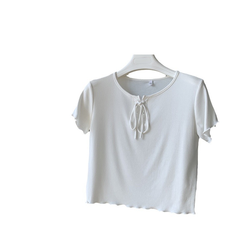白色绑带短袖t恤女夏性感设计感小众木耳边高腰短款显瘦纯色上衣