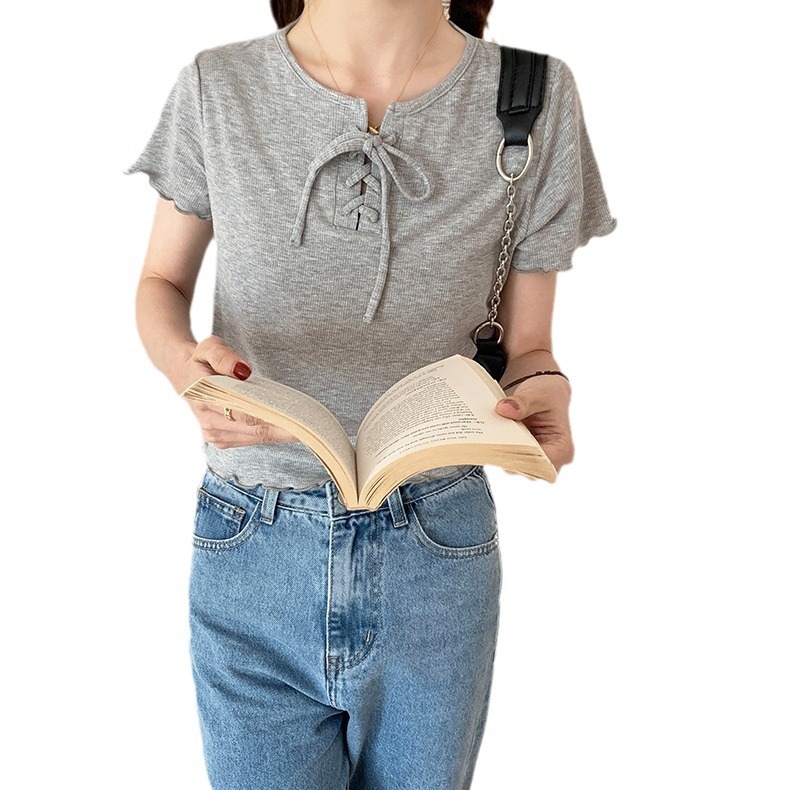 高腰短袖T恤女夏季新款修身短款小众木耳边体恤纯色上衣