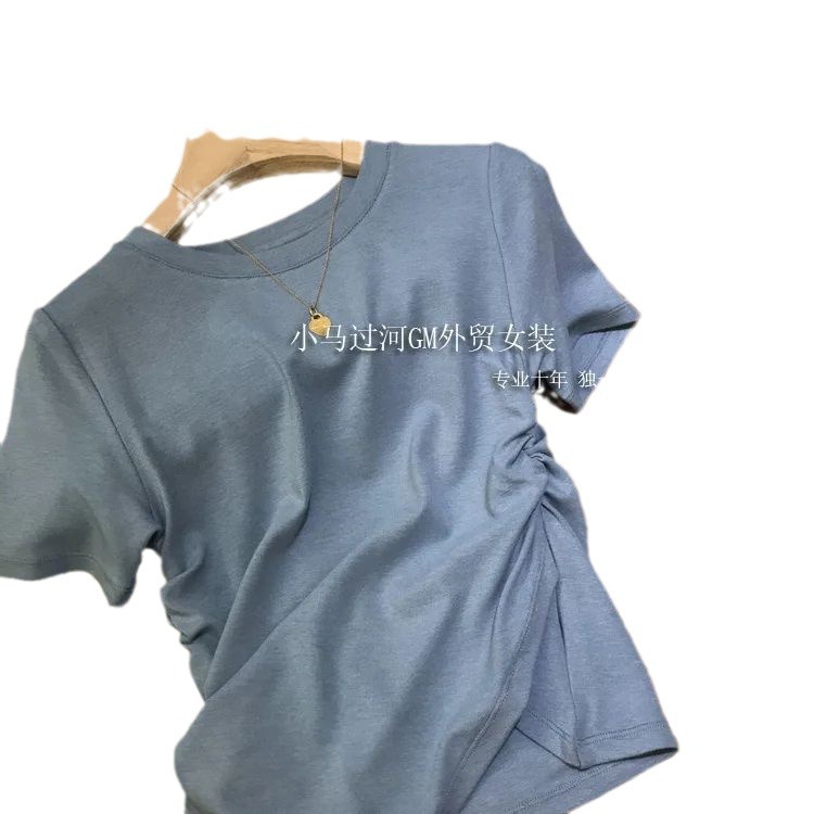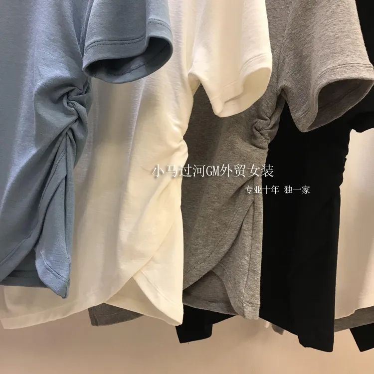 胖mm褶皱收腰上衣夏季新款简约百搭不规则纯色斜边圆领T恤女