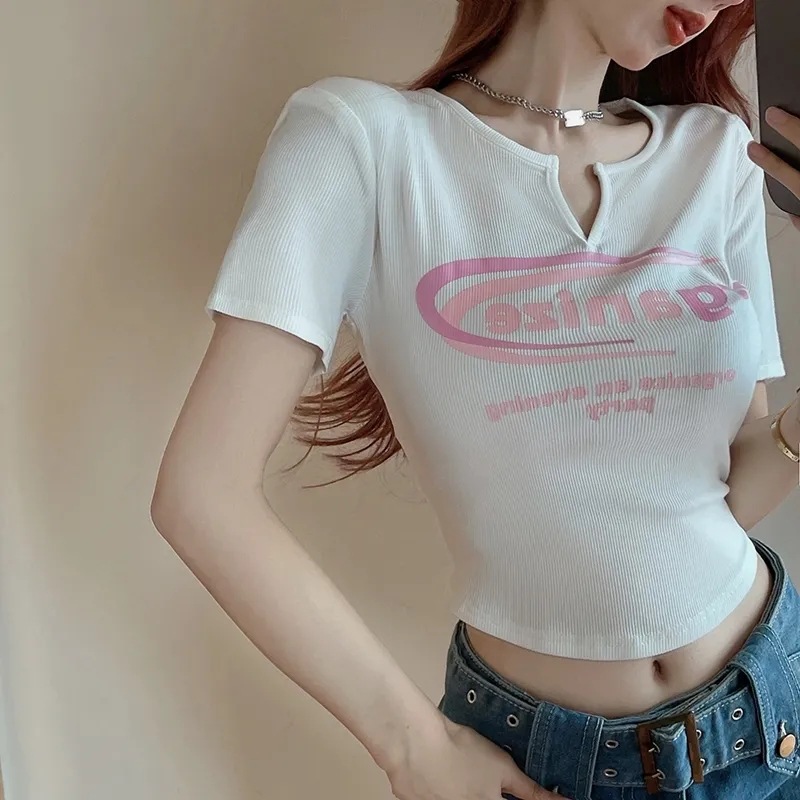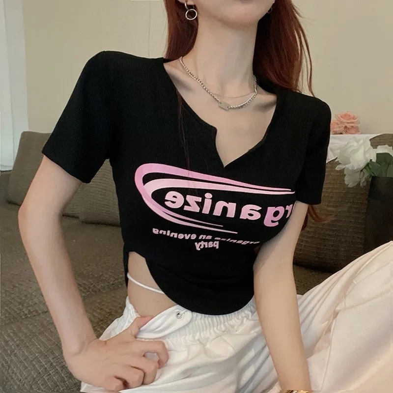 短袖修身V领字母印花短款露脐显瘦内搭ins洋气T恤上衣夏季女新款