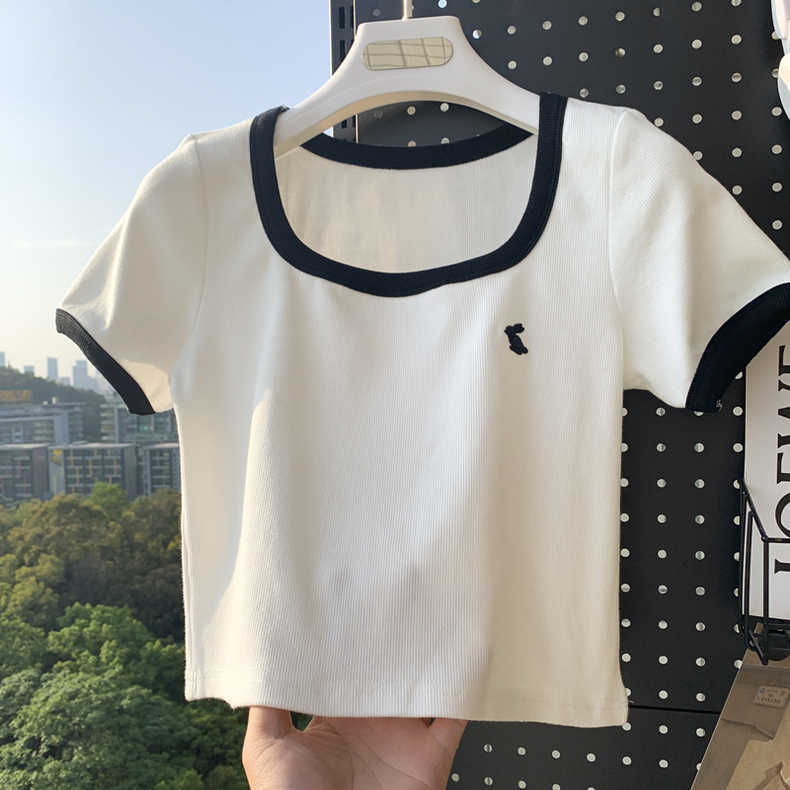 白色正肩t恤女撞色方领露锁骨夏季设计感刺绣修身显瘦短款上衣潮