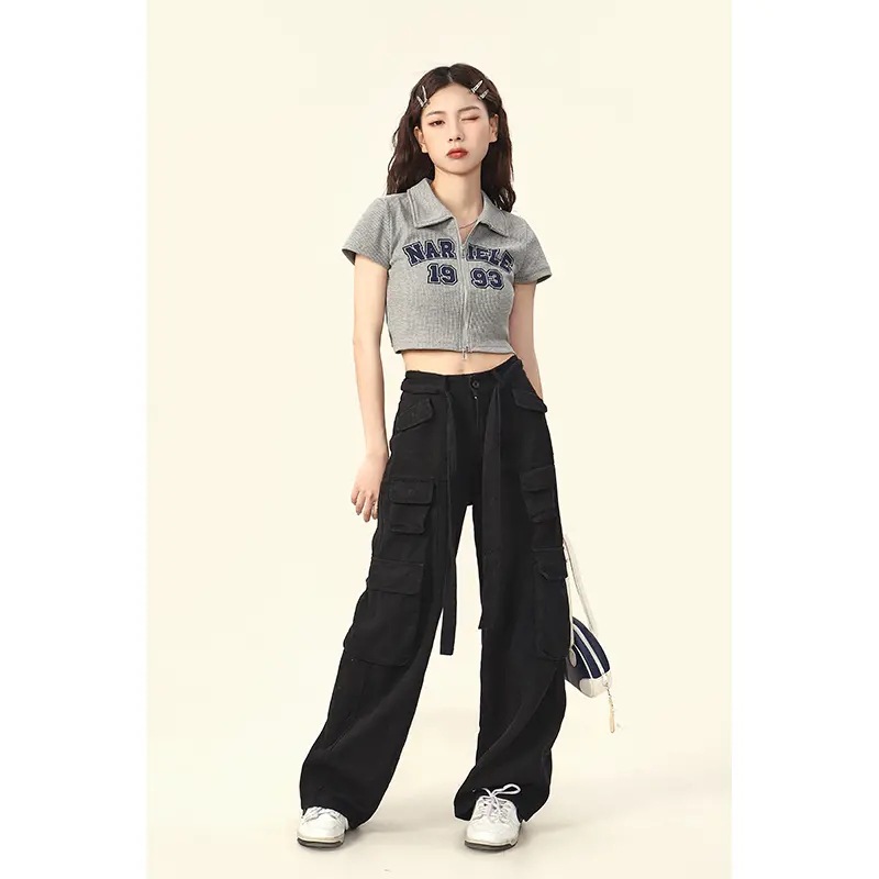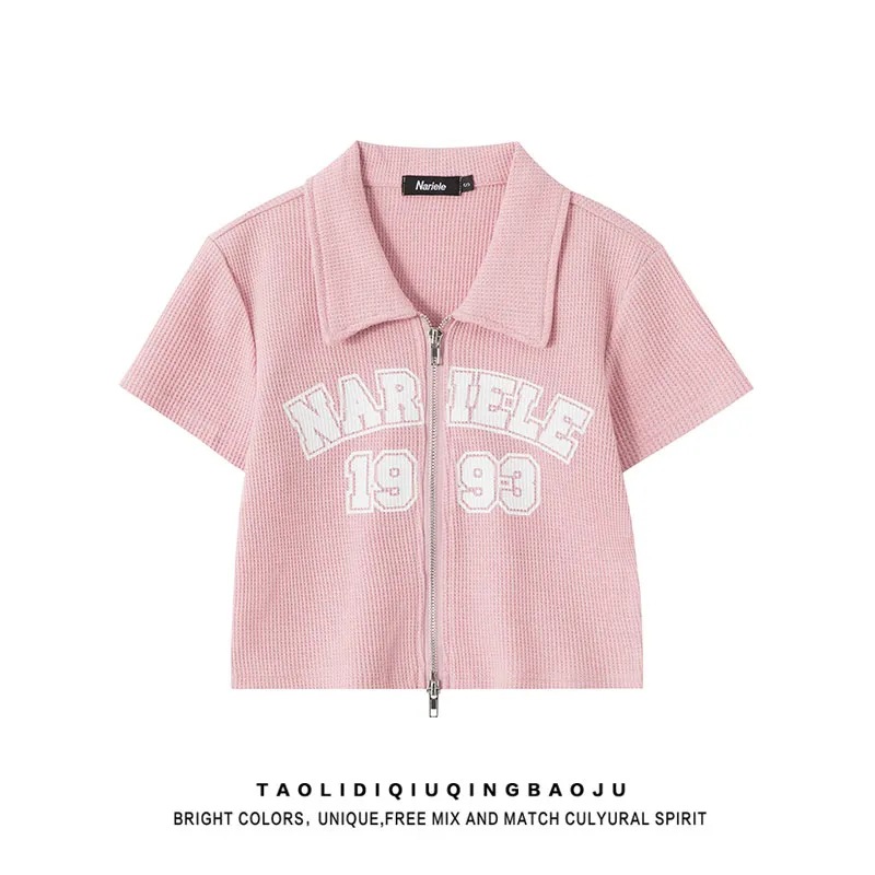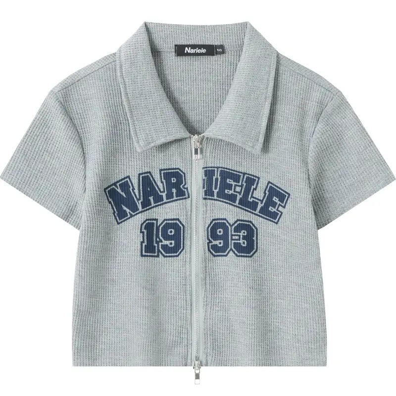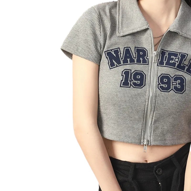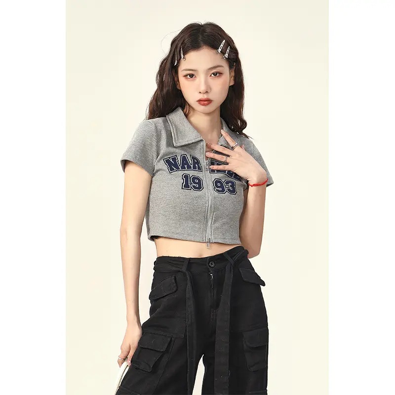 灰色polo领衫短袖t恤女夏季美式复古短款高腰辣妹开衫半袖上衣ins