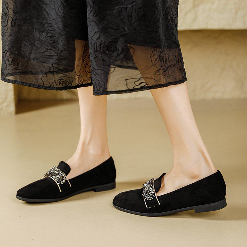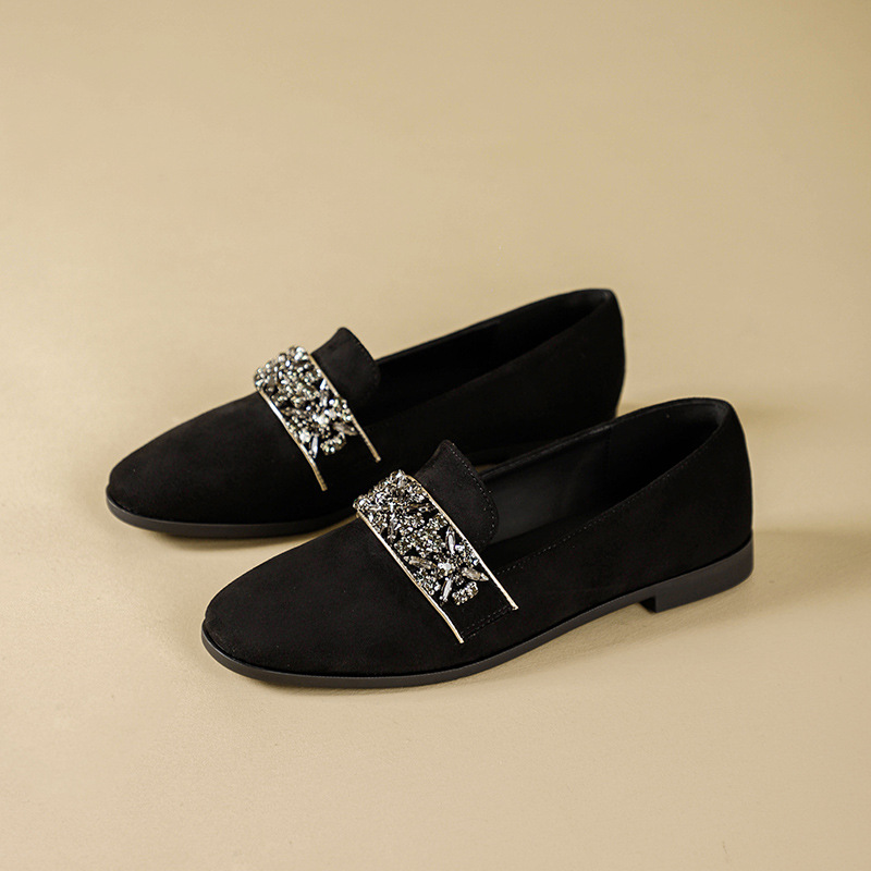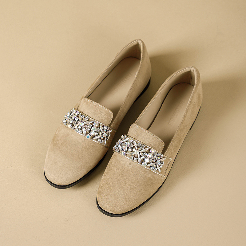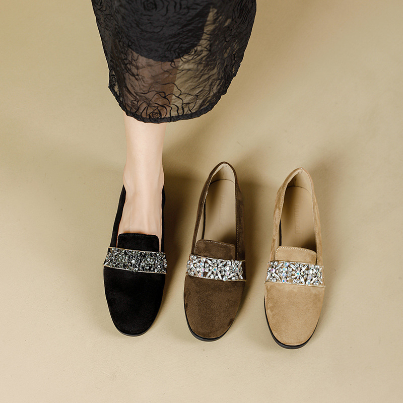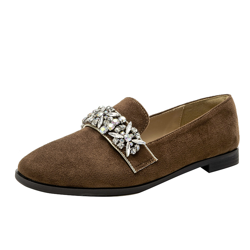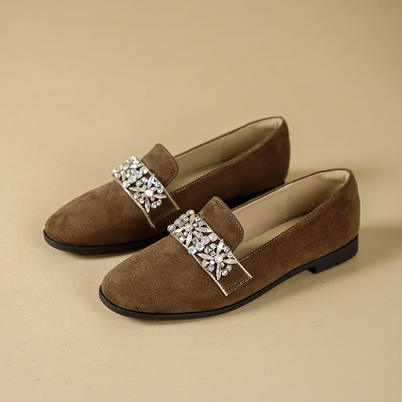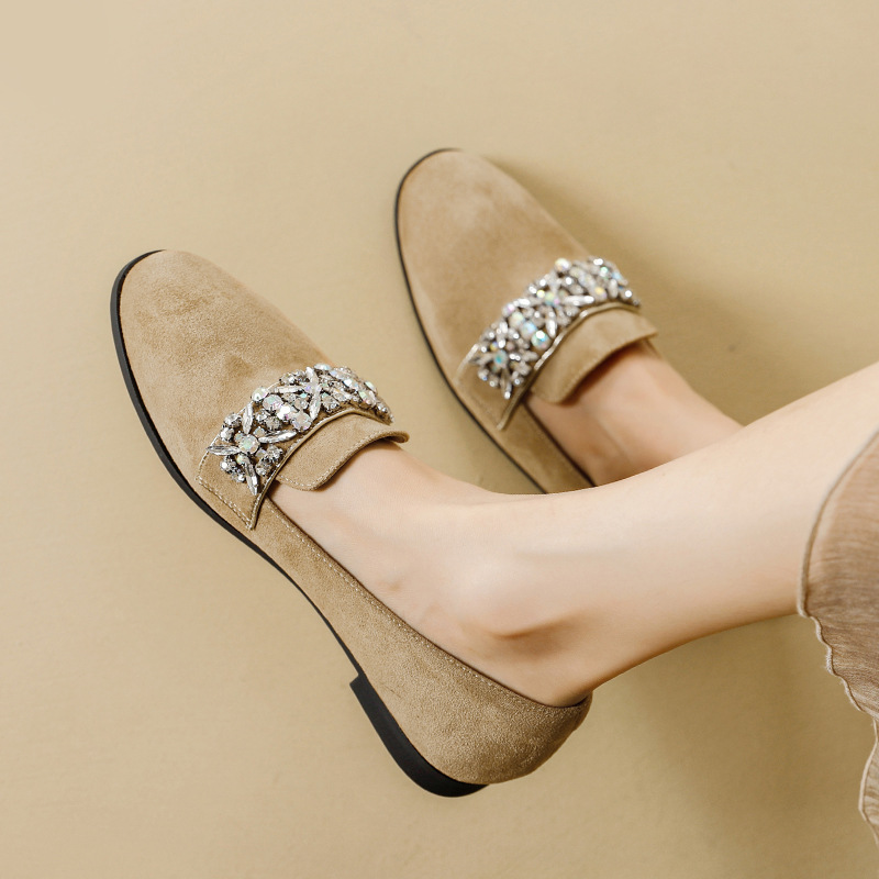 圆头棕色乐福鞋女新款水钻小皮鞋粗跟懒人鞋一脚蹬复古单鞋