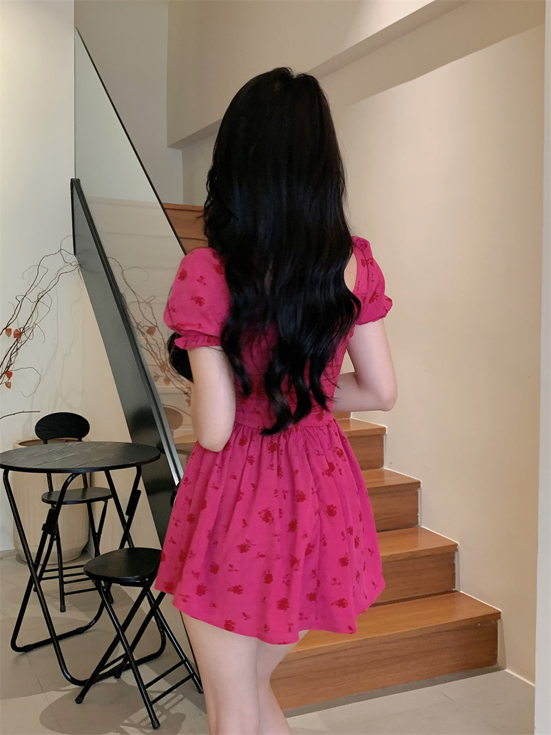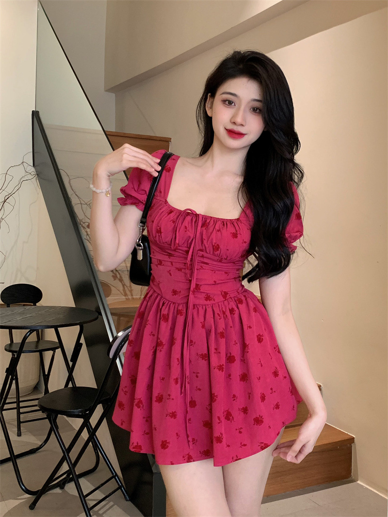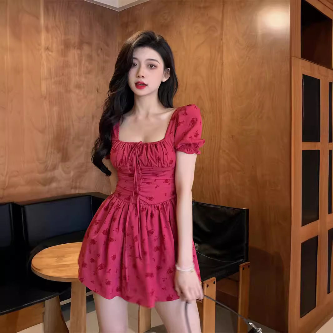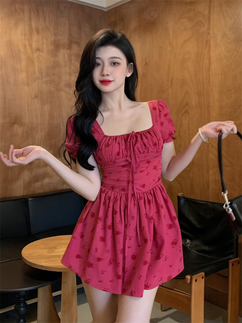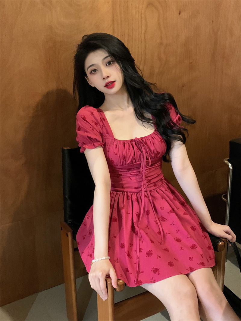 甜美泡泡袖方领裙子夏季新款收腰显瘦小众气质短袖连衣裙女