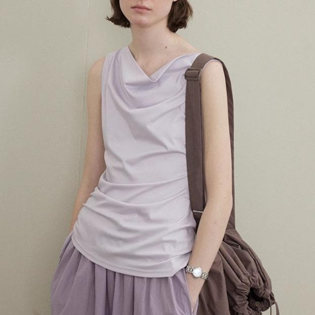 25夏女气质收腰堆堆领无袖紫色法式上身巨显瘦巨美上衣小衫