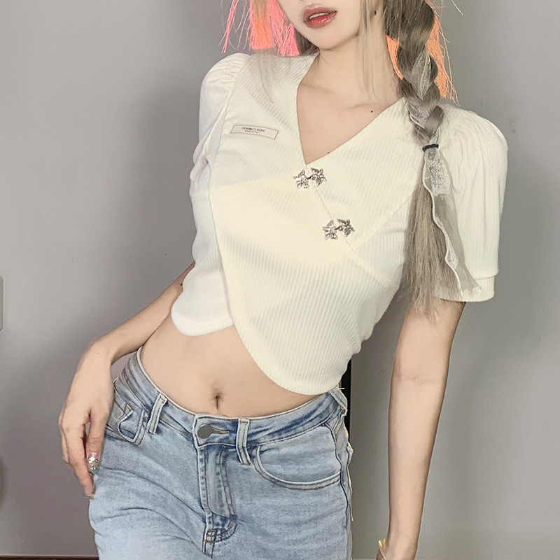 欧美夏季新款修身V字领拉链开衫露脐短袖T恤女