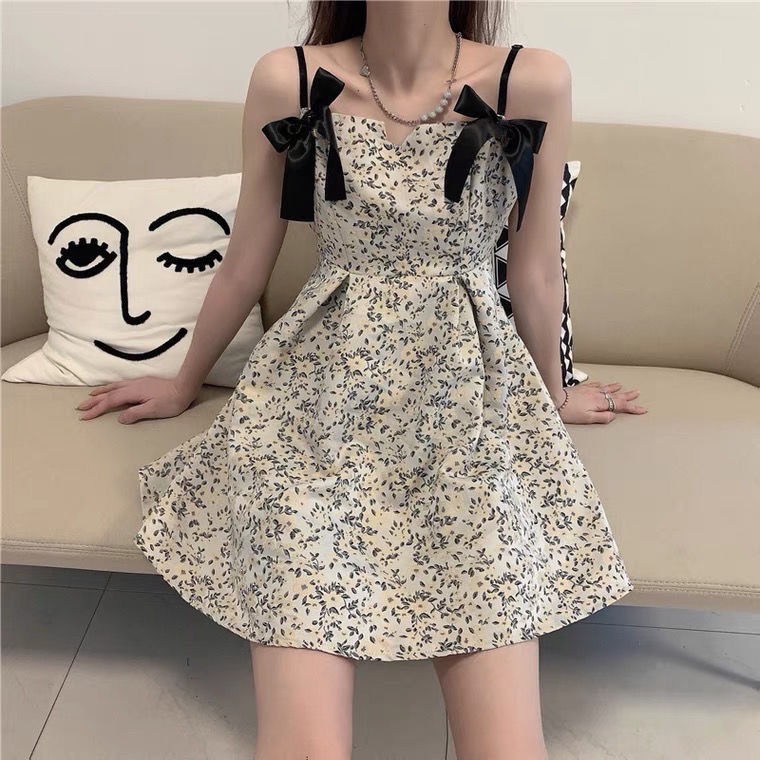 小个子碎花连衣裙女夏新款法式学院风短裙子蝴蝶结吊带A字裙