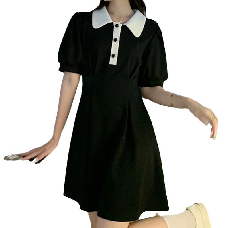 新款法式春夏季短袖连衣裙女翻领拼色时尚百搭收腰学院风甜美少女