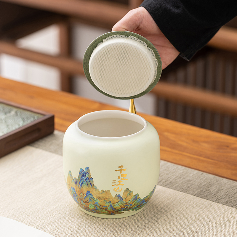 高档千里江山陶瓷茶叶罐通用绿茶红茶白茶散茶密封罐大容量储茶罐
