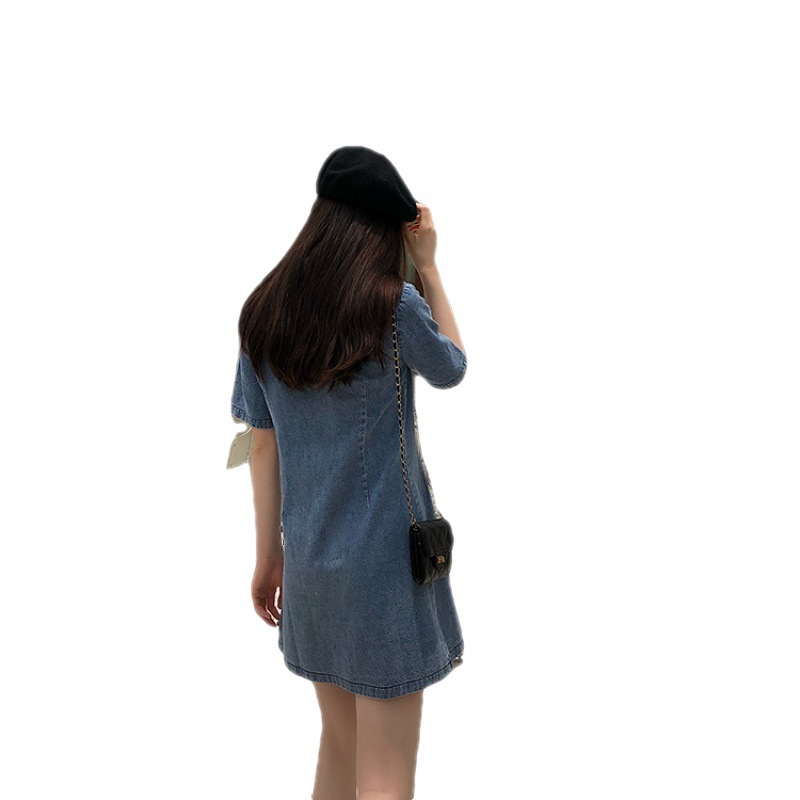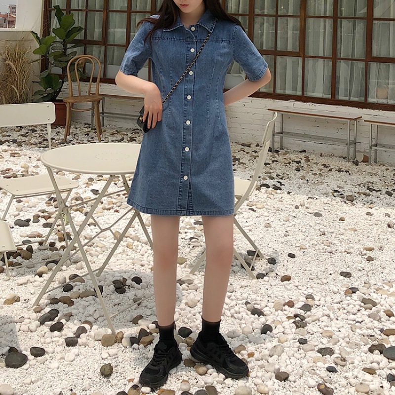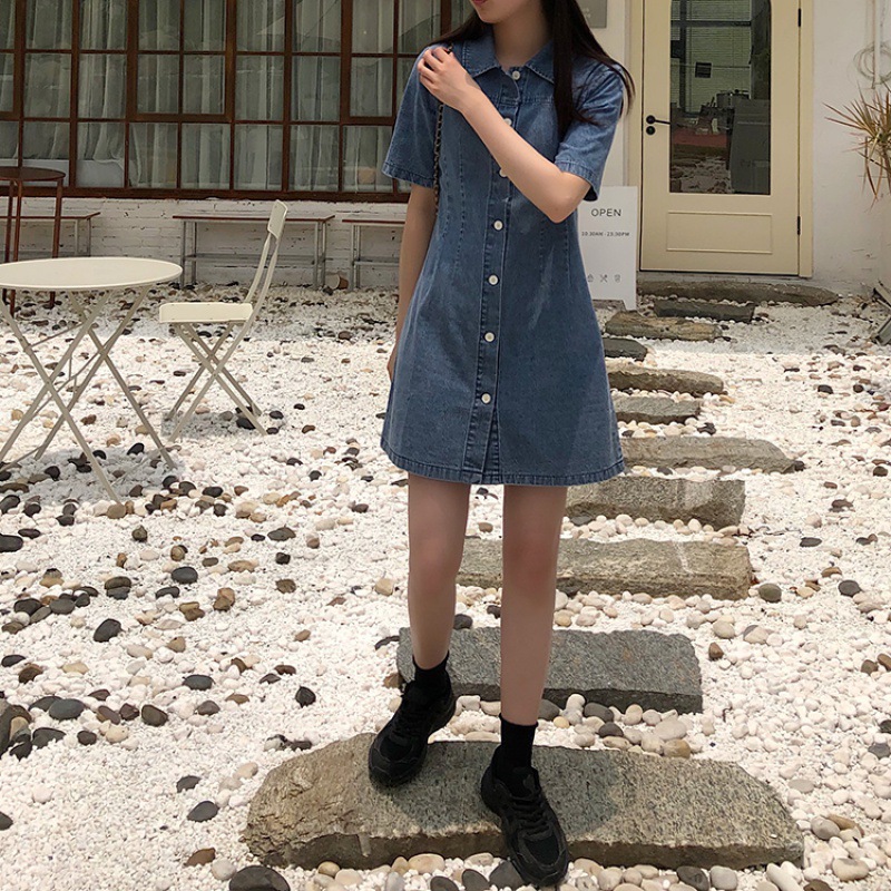 学院风Polo领牛仔裙女夏季通勤百搭单排扣收腰显瘦A字连衣裙
