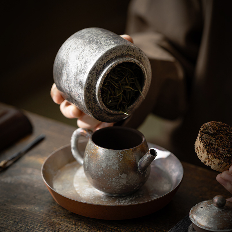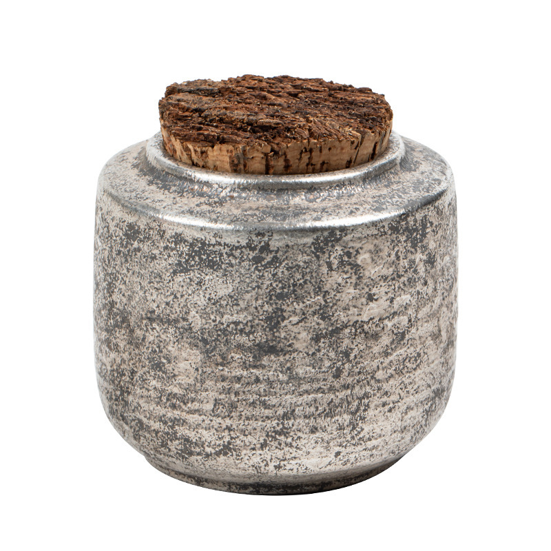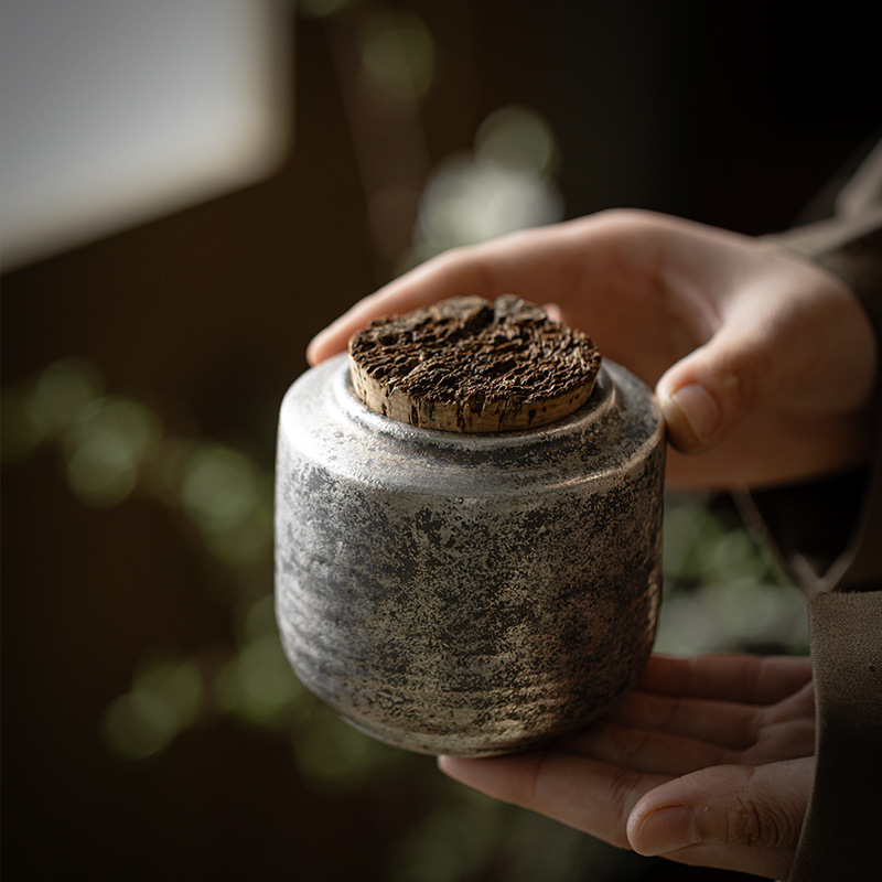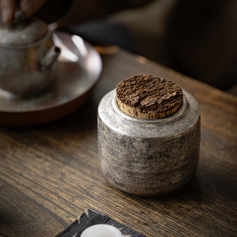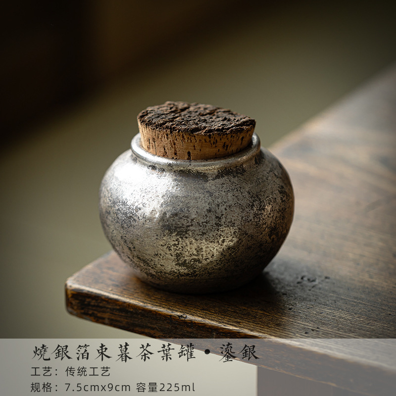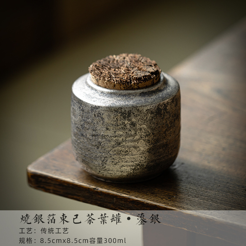 鎏银烧银箔粗陶木塞小号茶叶罐密封防潮罐子家用小容量存茶罐