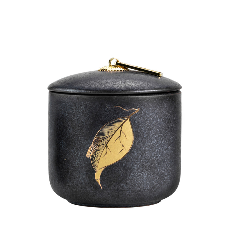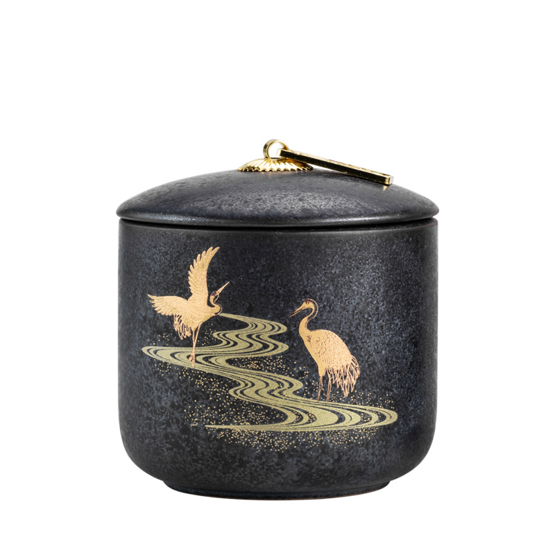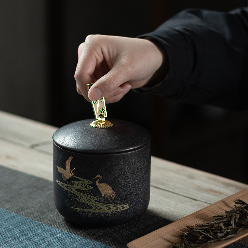 粗陶窑变银斑瑞鹤呈祥金枝玉叶茶叶罐陶瓷小号茶叶罐密封储物