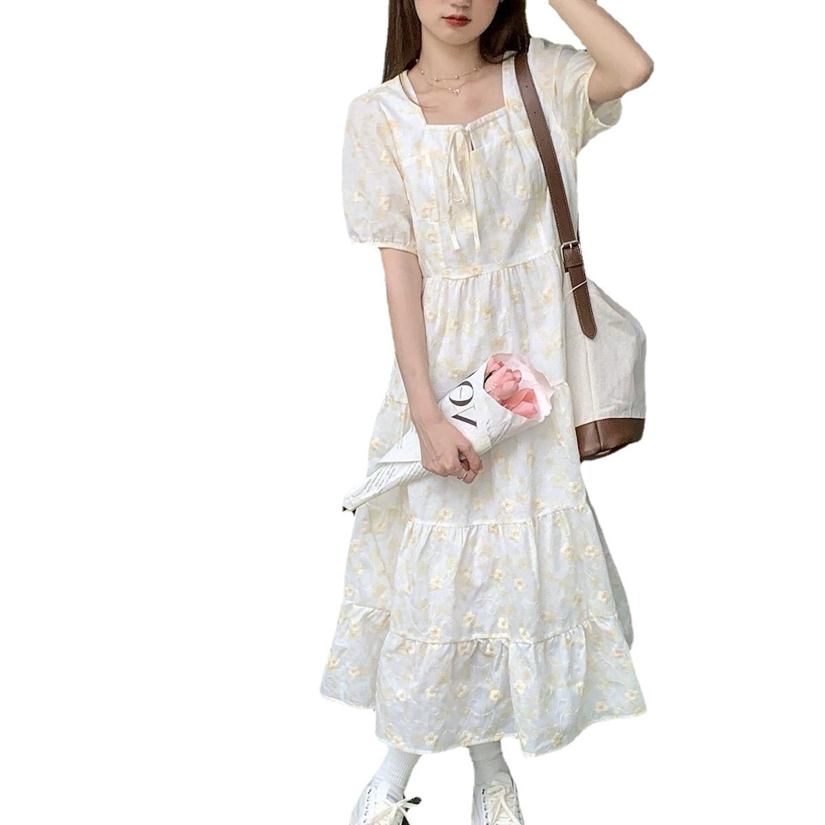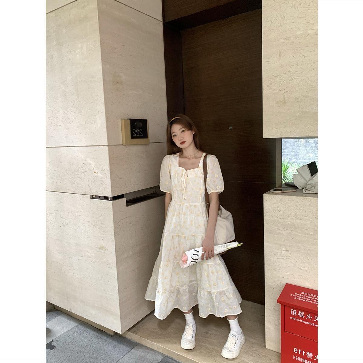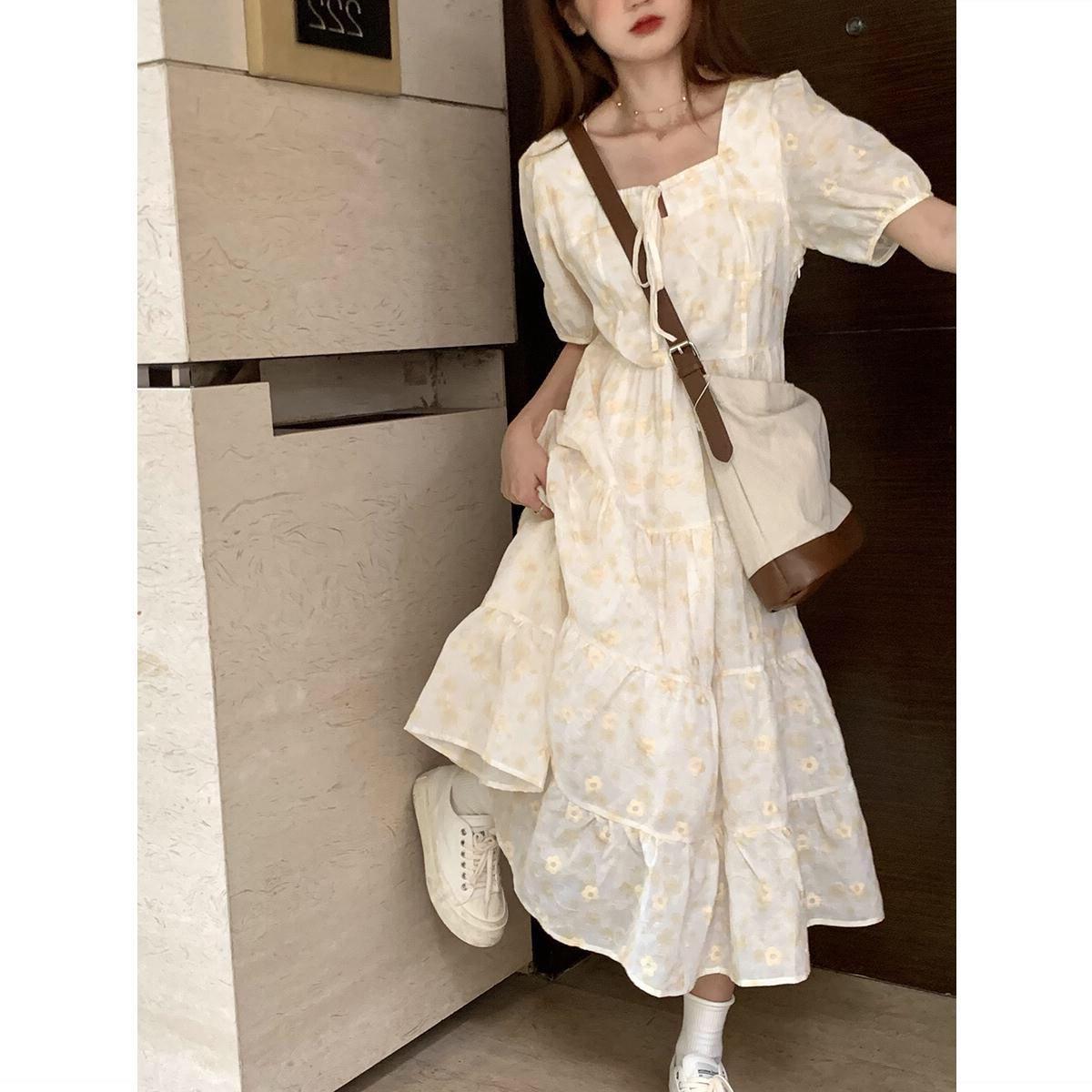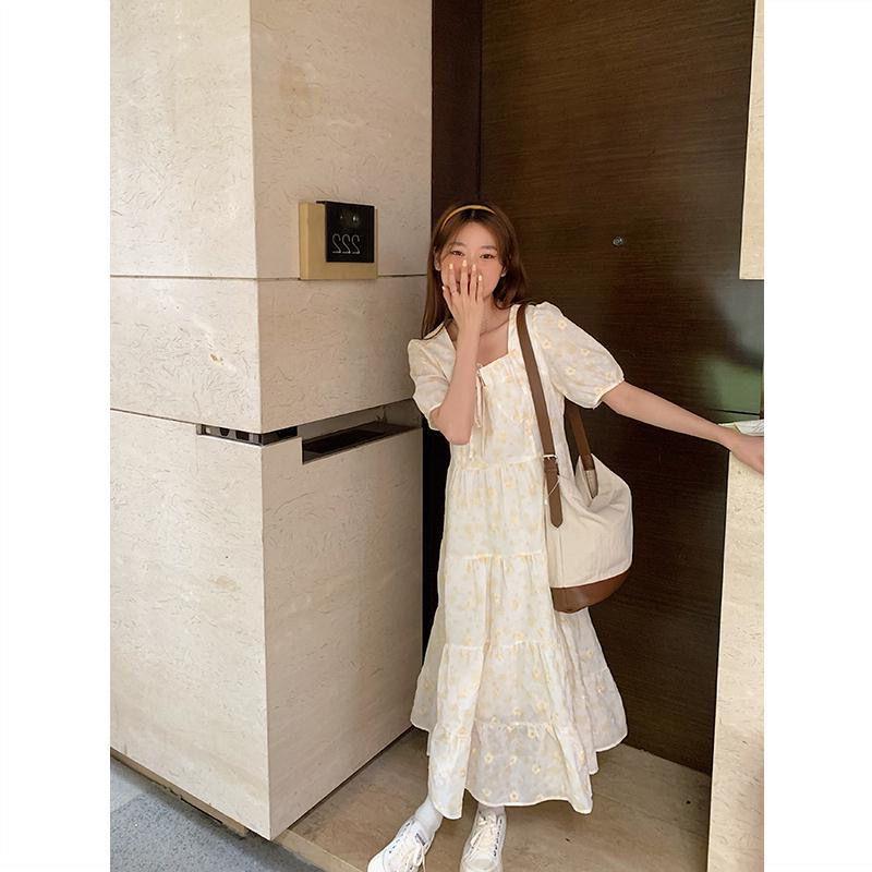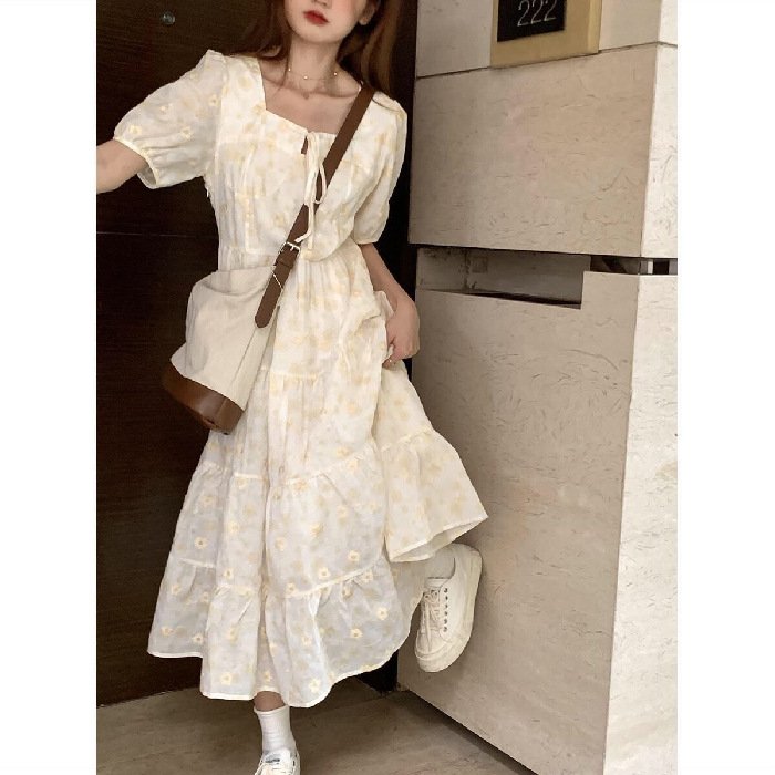 韩系绑带新款甜美学院风蕾丝蓬蓬碎花连衣裙女学生方领宽松中长款
