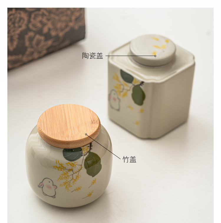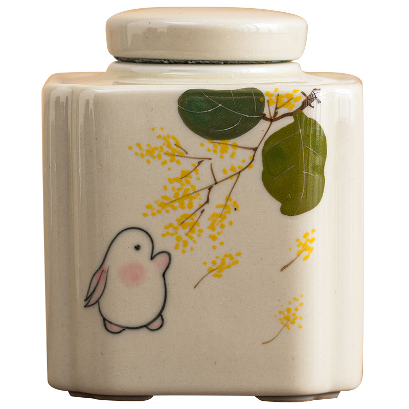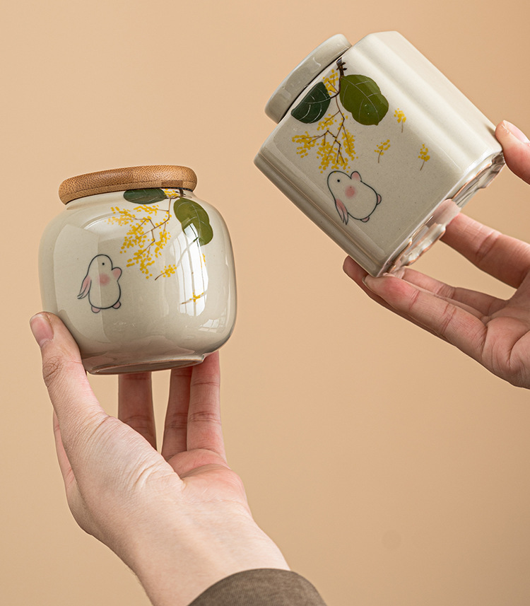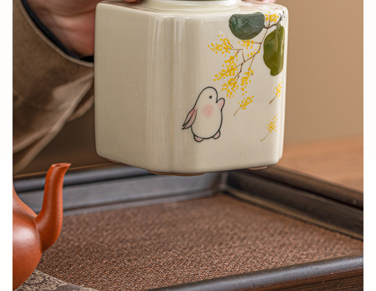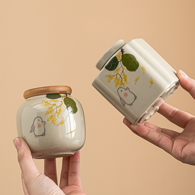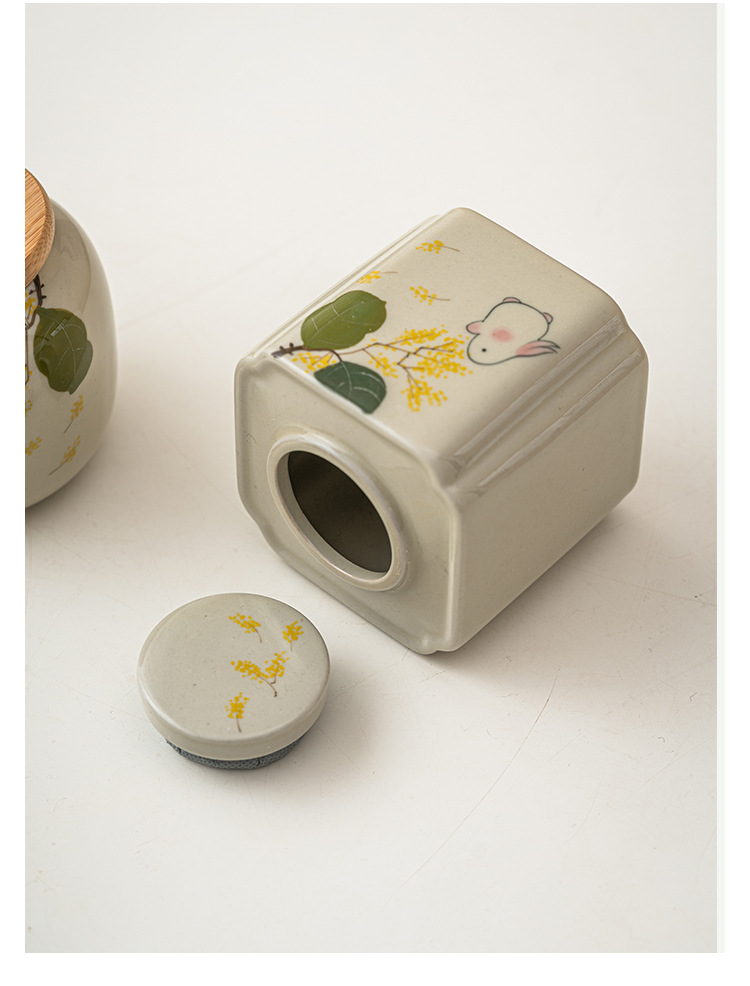 手绘金桂月兔茶叶罐密封罐小号便携陶瓷存茶罐防潮家用储物罐茶仓