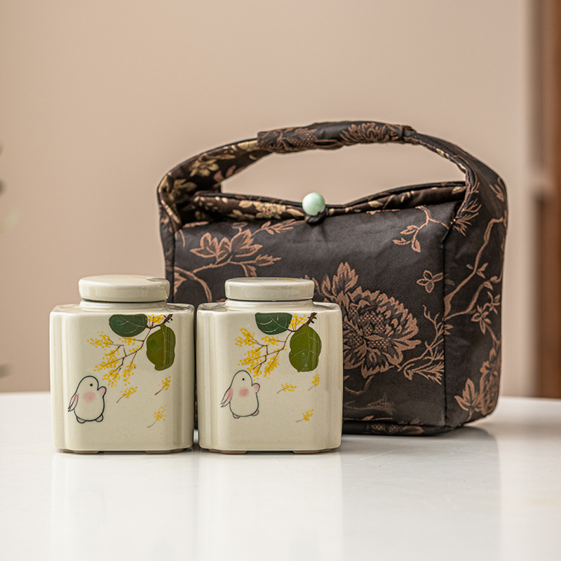 纯手绘金桂月兔_两只装小三元茶叶罐【收纳布包】