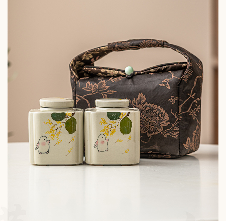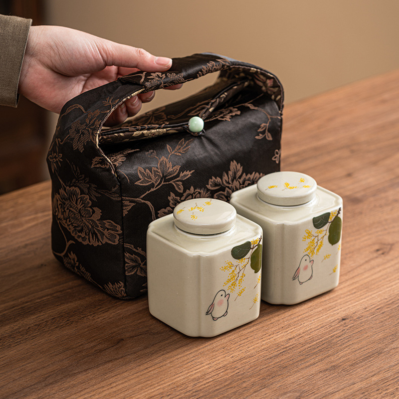 纯手绘金桂月兔_两只装方形茶叶罐【收纳布包】