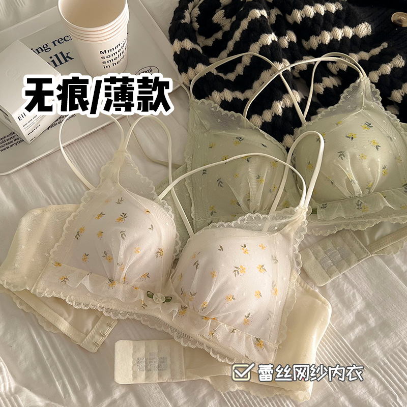 小碎花法式三角杯大学女生小胸聚拢薄杯内衣蕾丝美背文胸