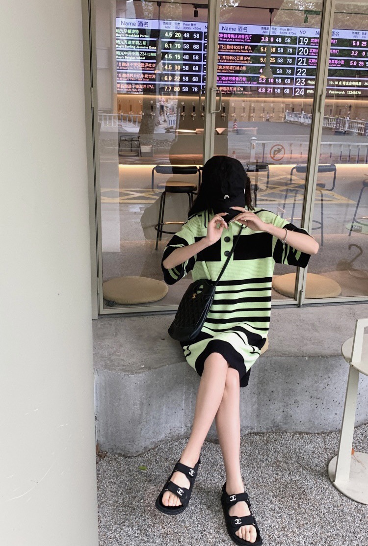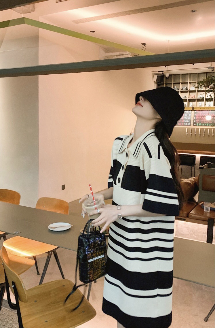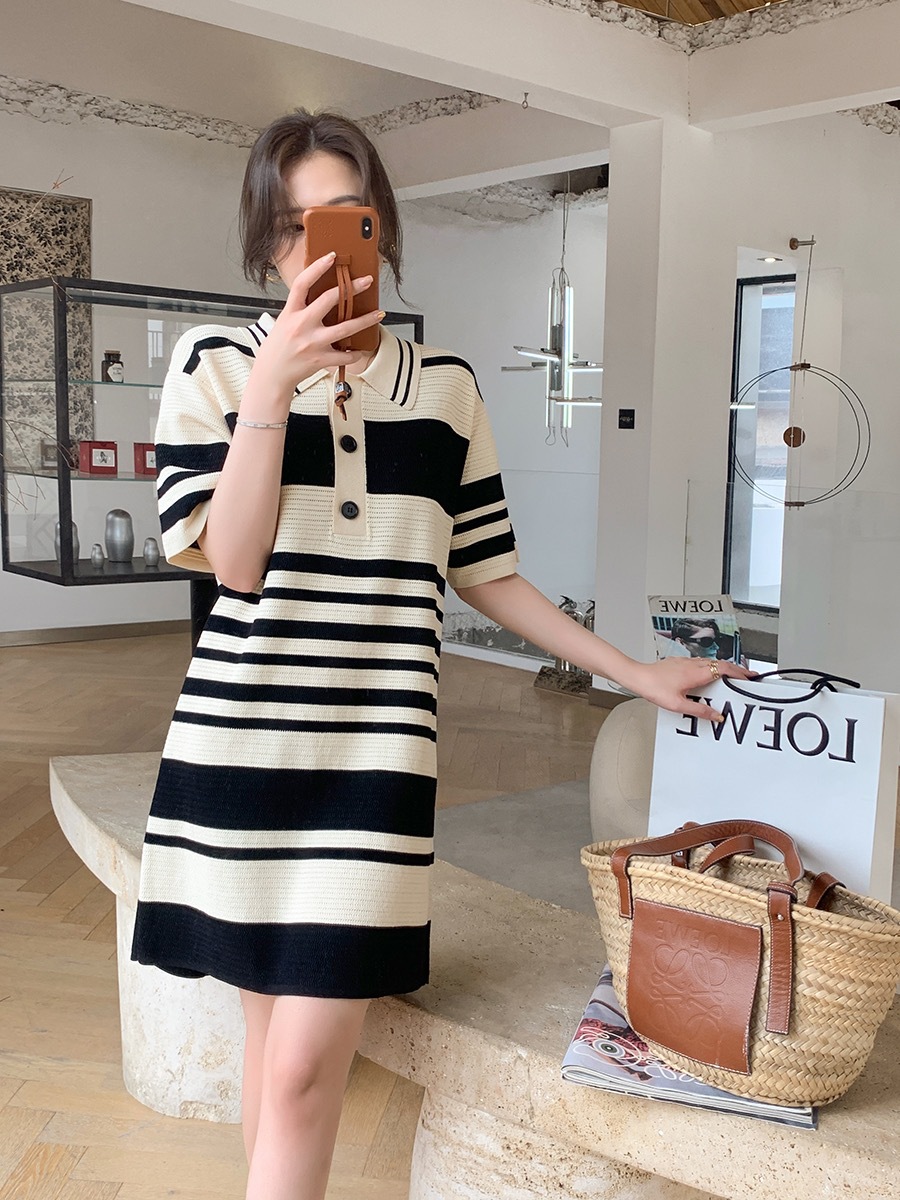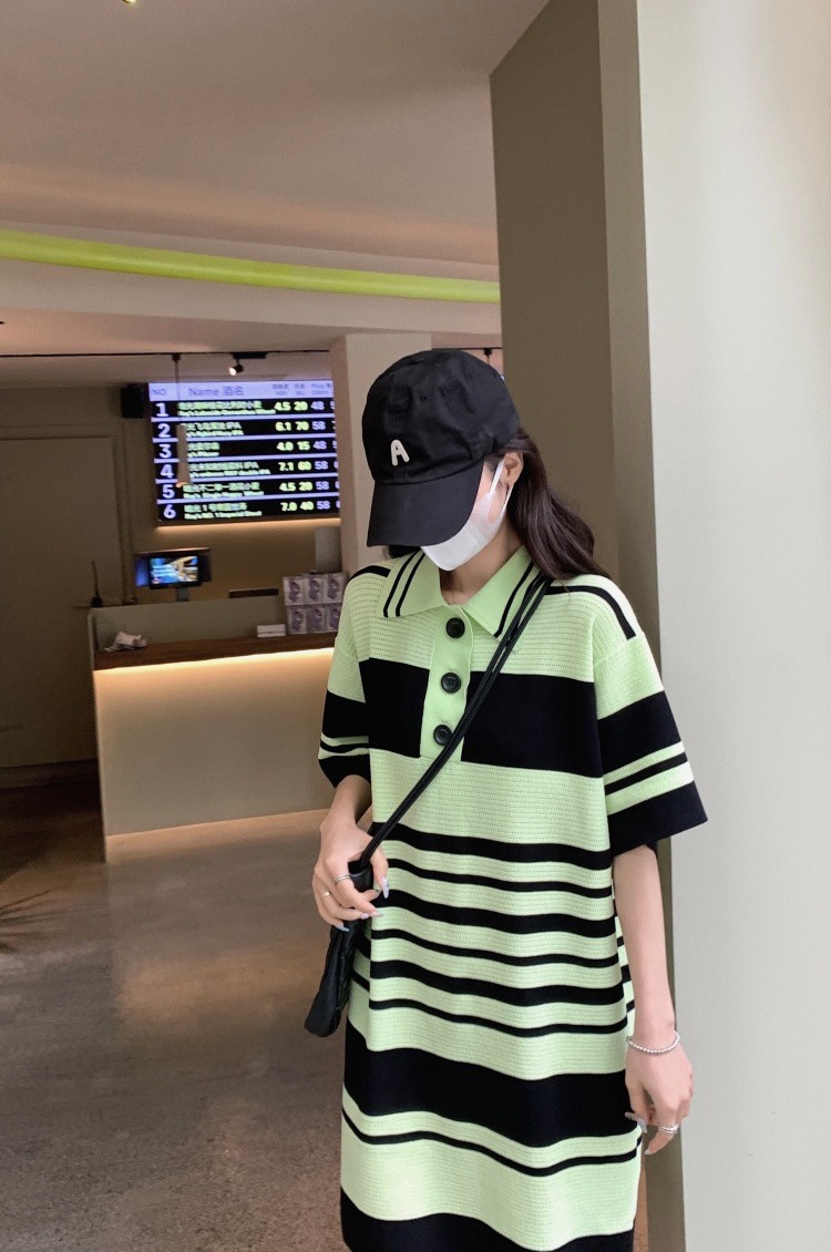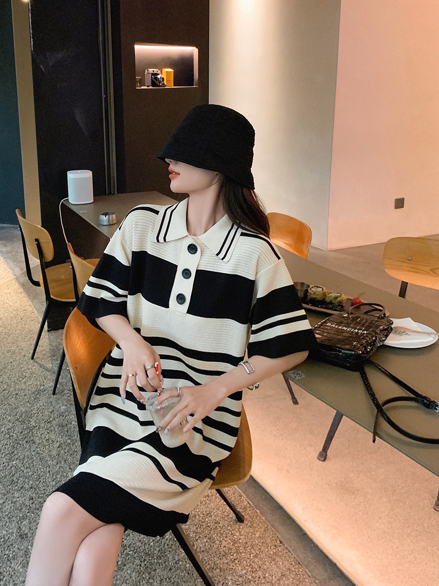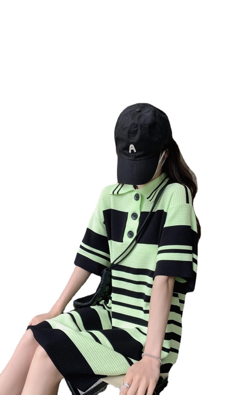 夏季新款冰丝条纹翻领短袖连衣裙薄款宽松睡裙可外穿女士