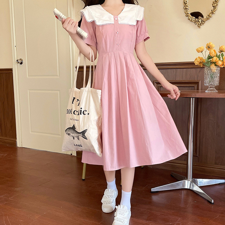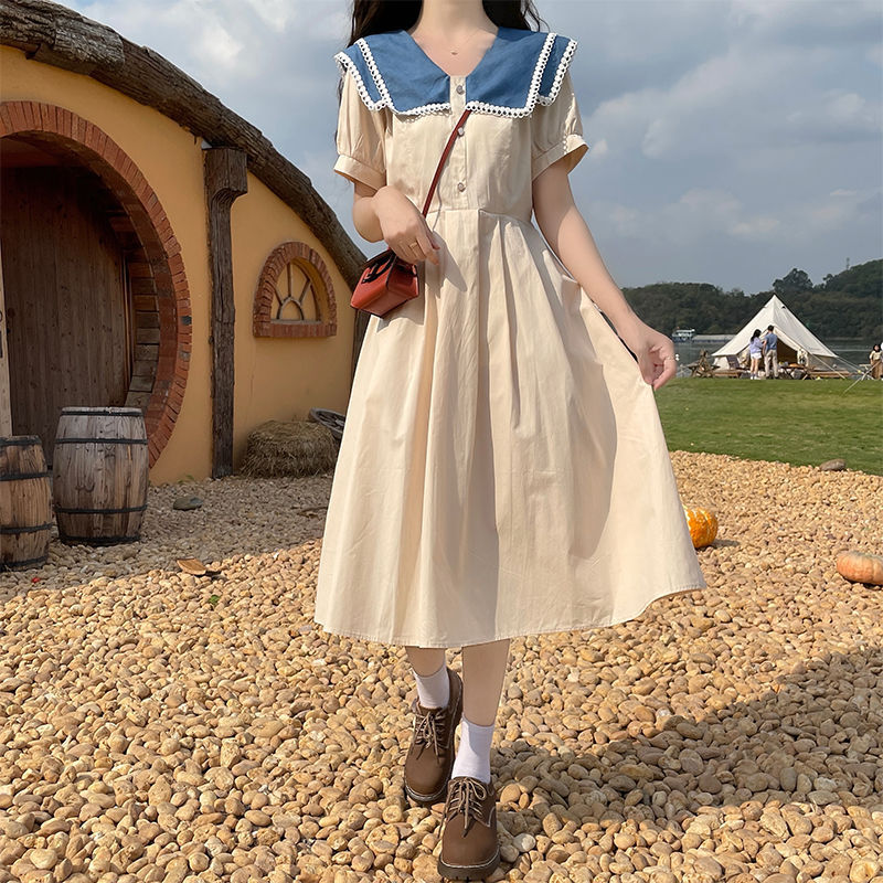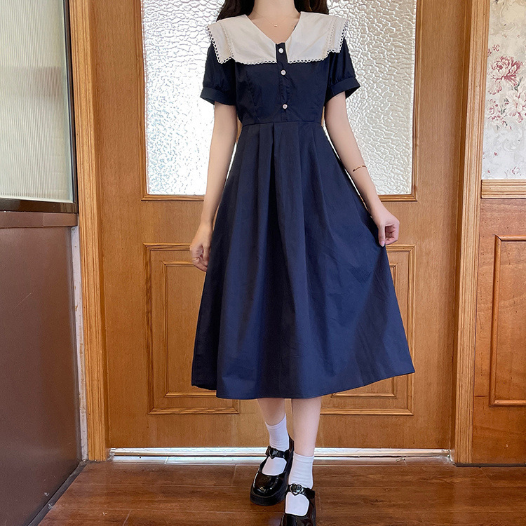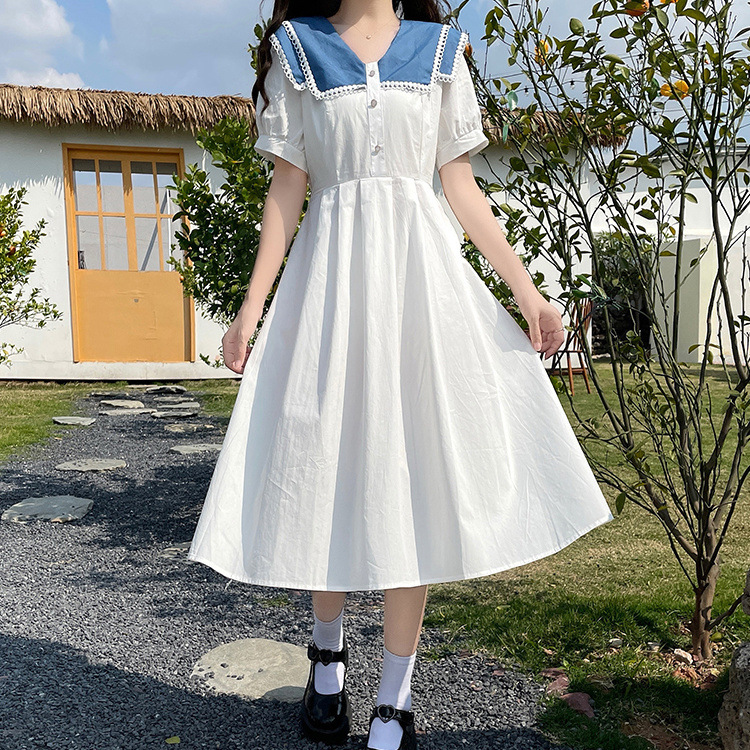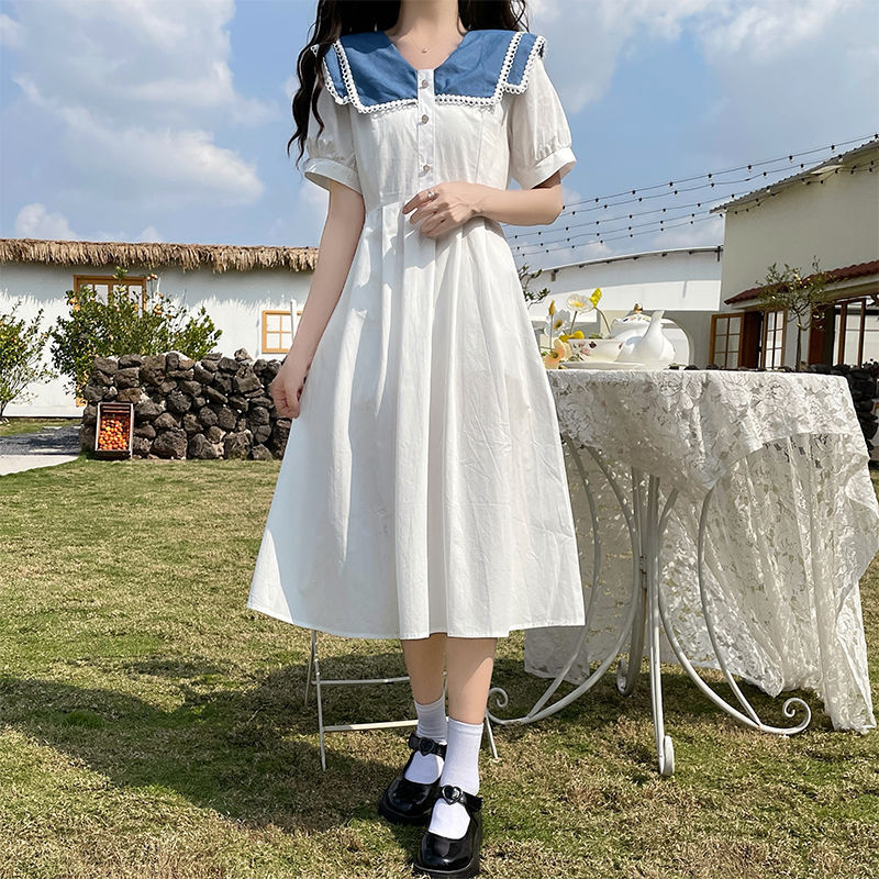 韩版学院风海军领连衣裙女夏季中长款宽松减龄洋气短袖条纹T恤裙