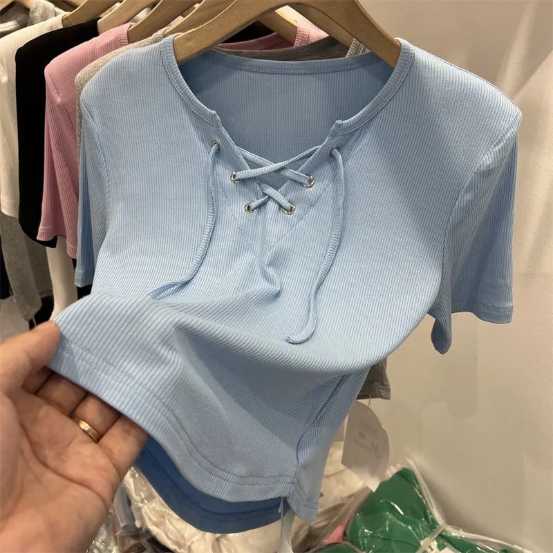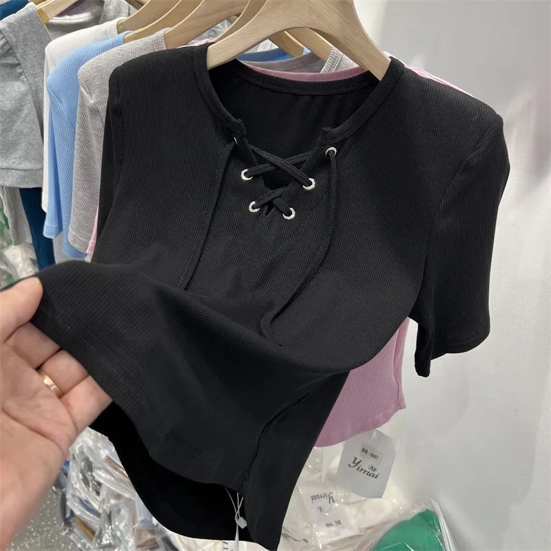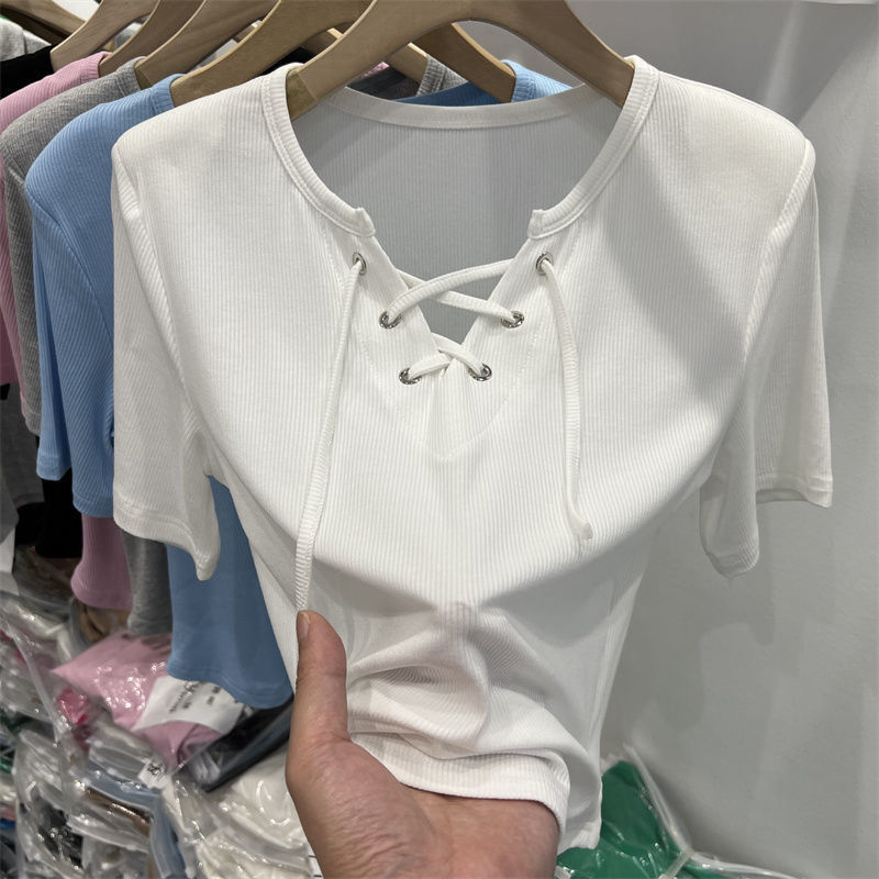 设计感小众绑带螺纹短袖t恤女夏装韩版新款修身洋气圆弧小衫上衣