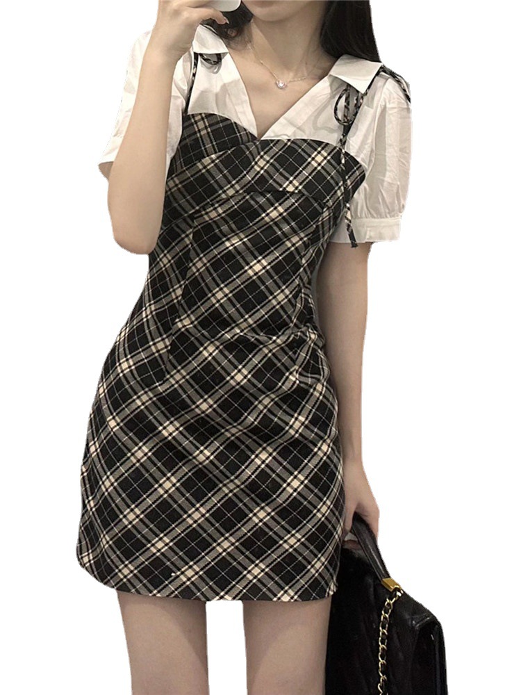 假两件衬衫拼接格子连衣裙夏新款小众设计感学院风短款裙子女