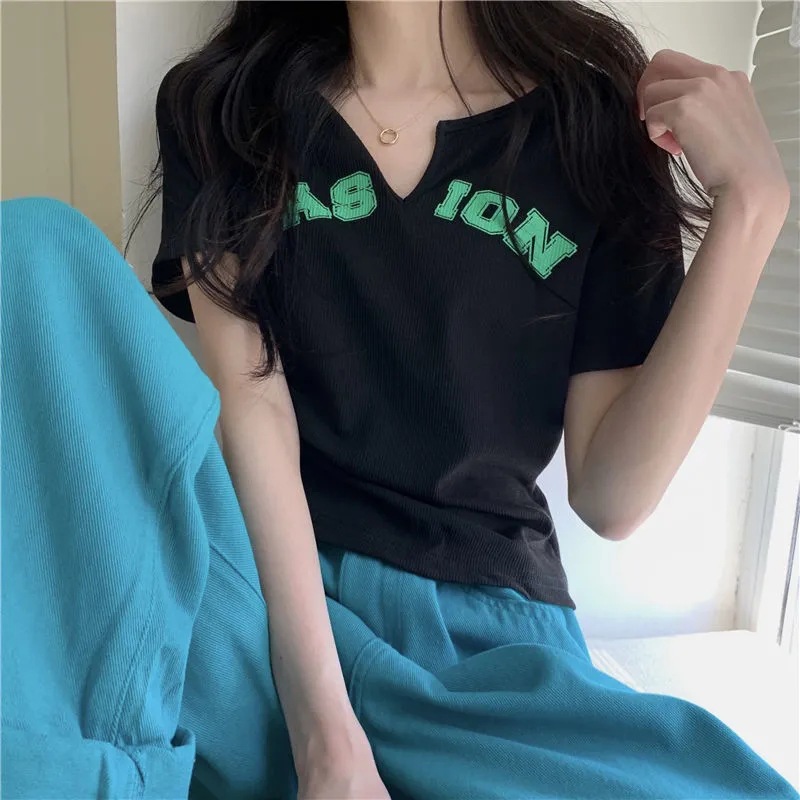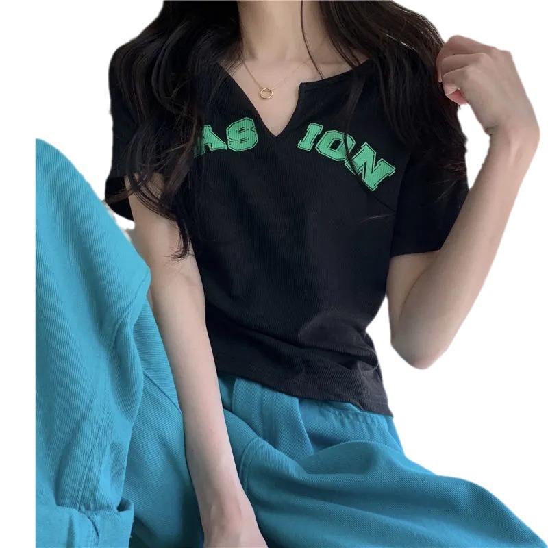 清仓捡漏折扣小众V领字母印花短袖T恤女夏短款显瘦设计感打底上衣