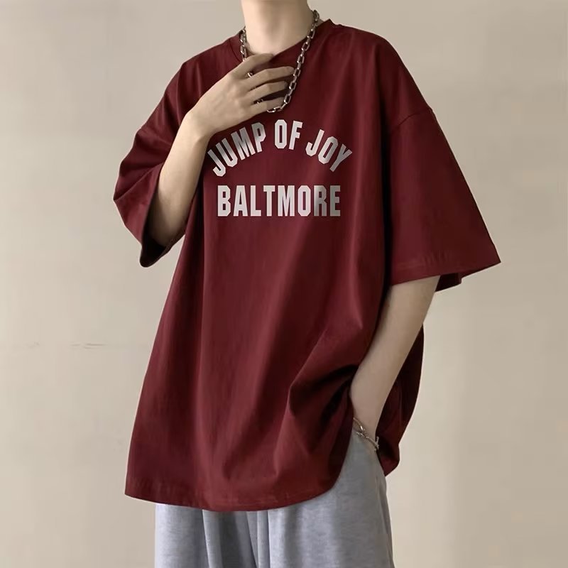 酒红色美式短袖t恤男潮牌夏季oversize重磅衣服潮流上衣