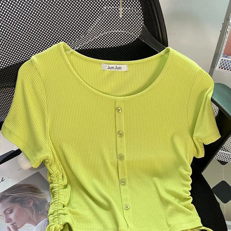 设计感小众绑带螺纹短袖t恤女夏装韩版新款修身洋气圆弧小衫上衣