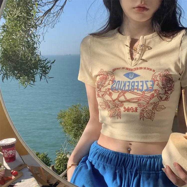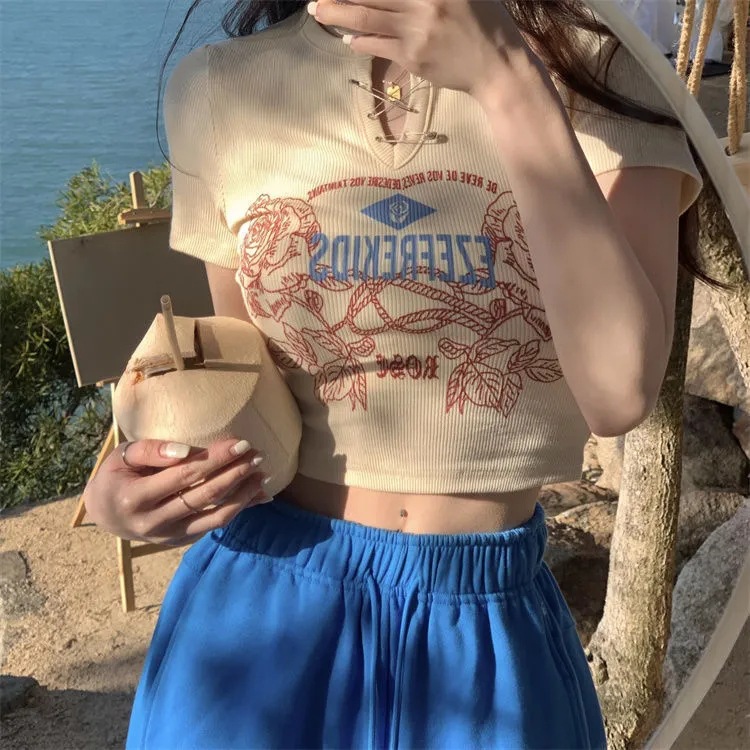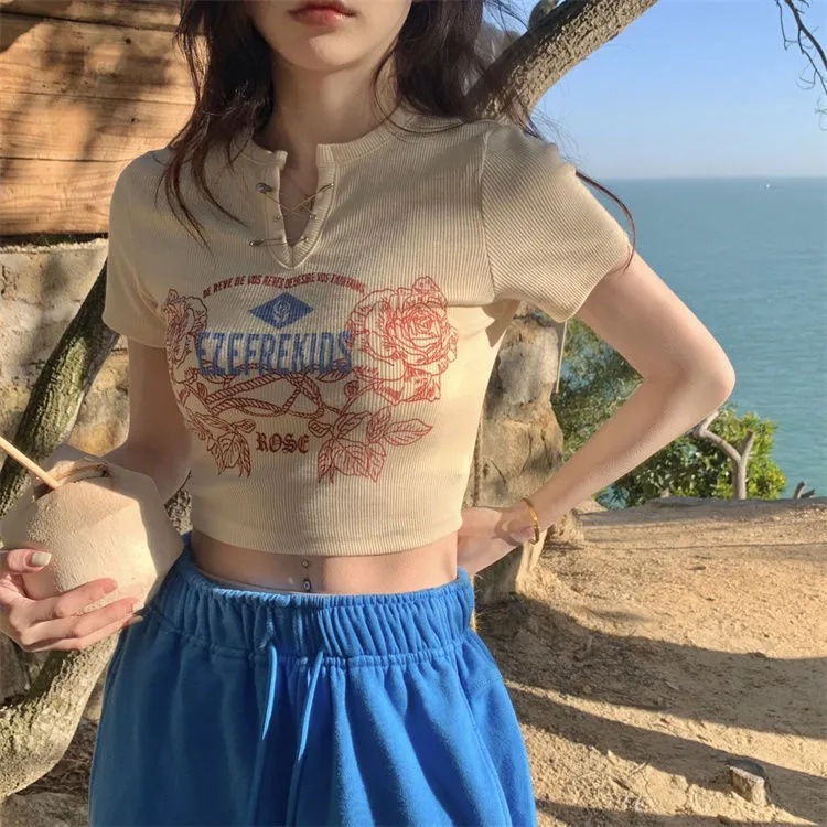印花露脐短袖T恤女夏季甜辣小众修身短款上衣显瘦高腰百搭打底衫