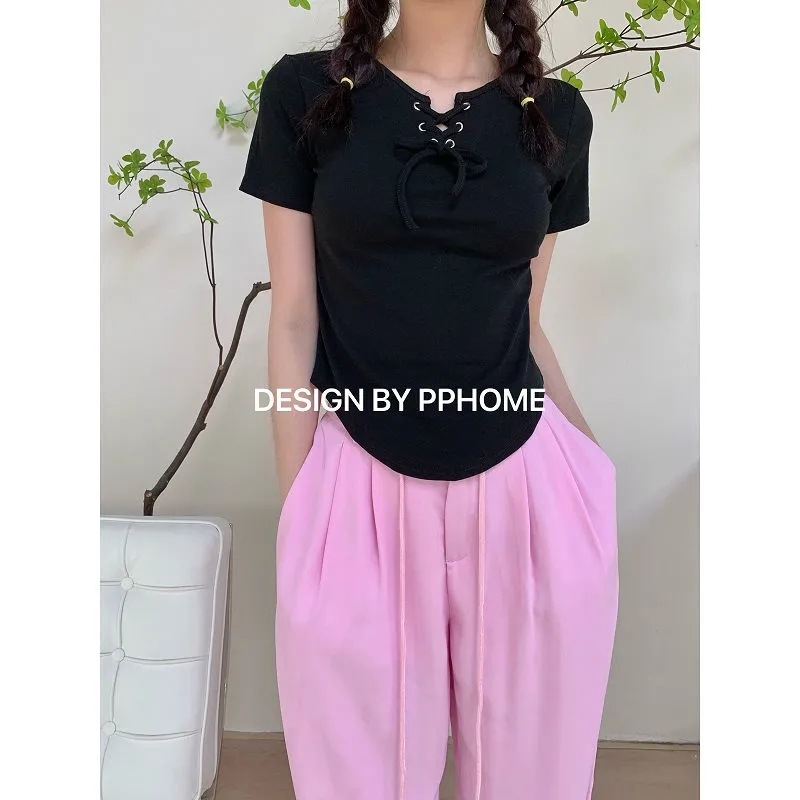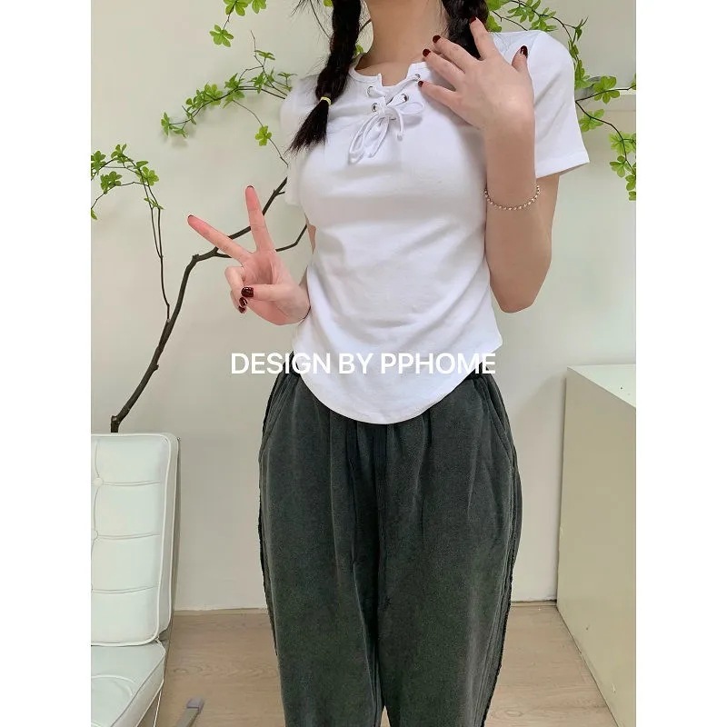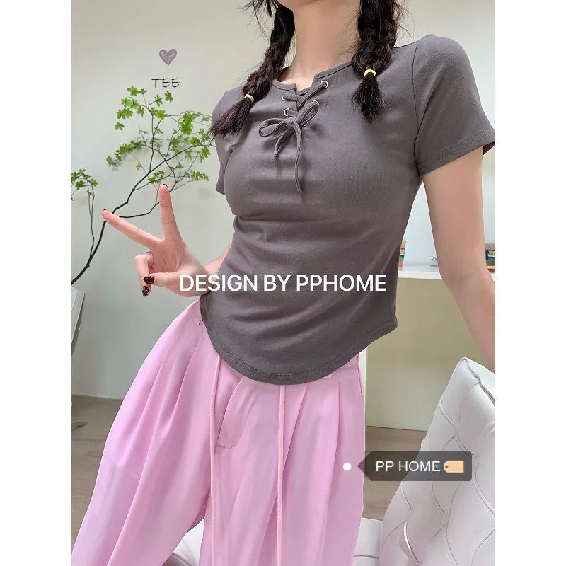 短袖t恤女新款夏季小众别致设计感交叉绑带短款打底衫上衣潮