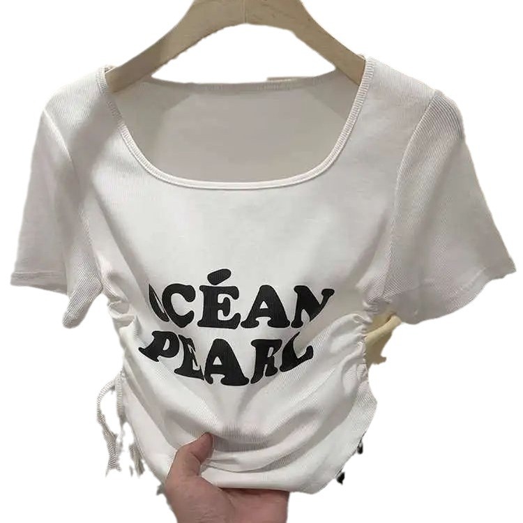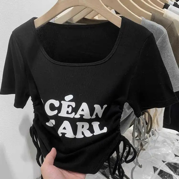 抽绳设计感方领短袖T恤女字母印花时尚修身夏季新款百搭休闲上衣