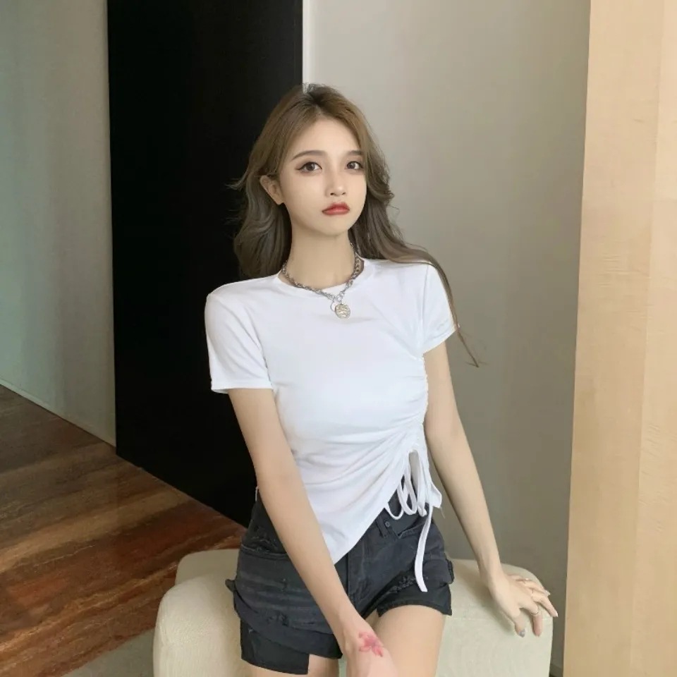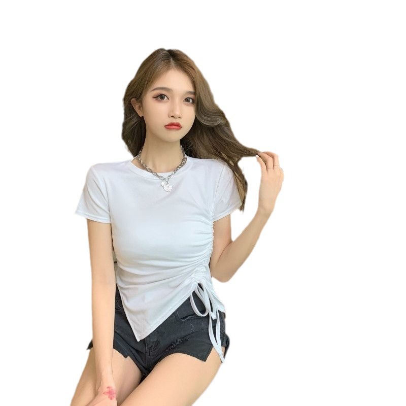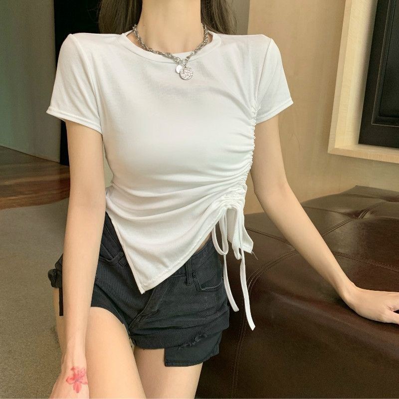 开叉抽绳短袖t恤女夏季设计感特大码女装不规则显瘦短款高腰上衣