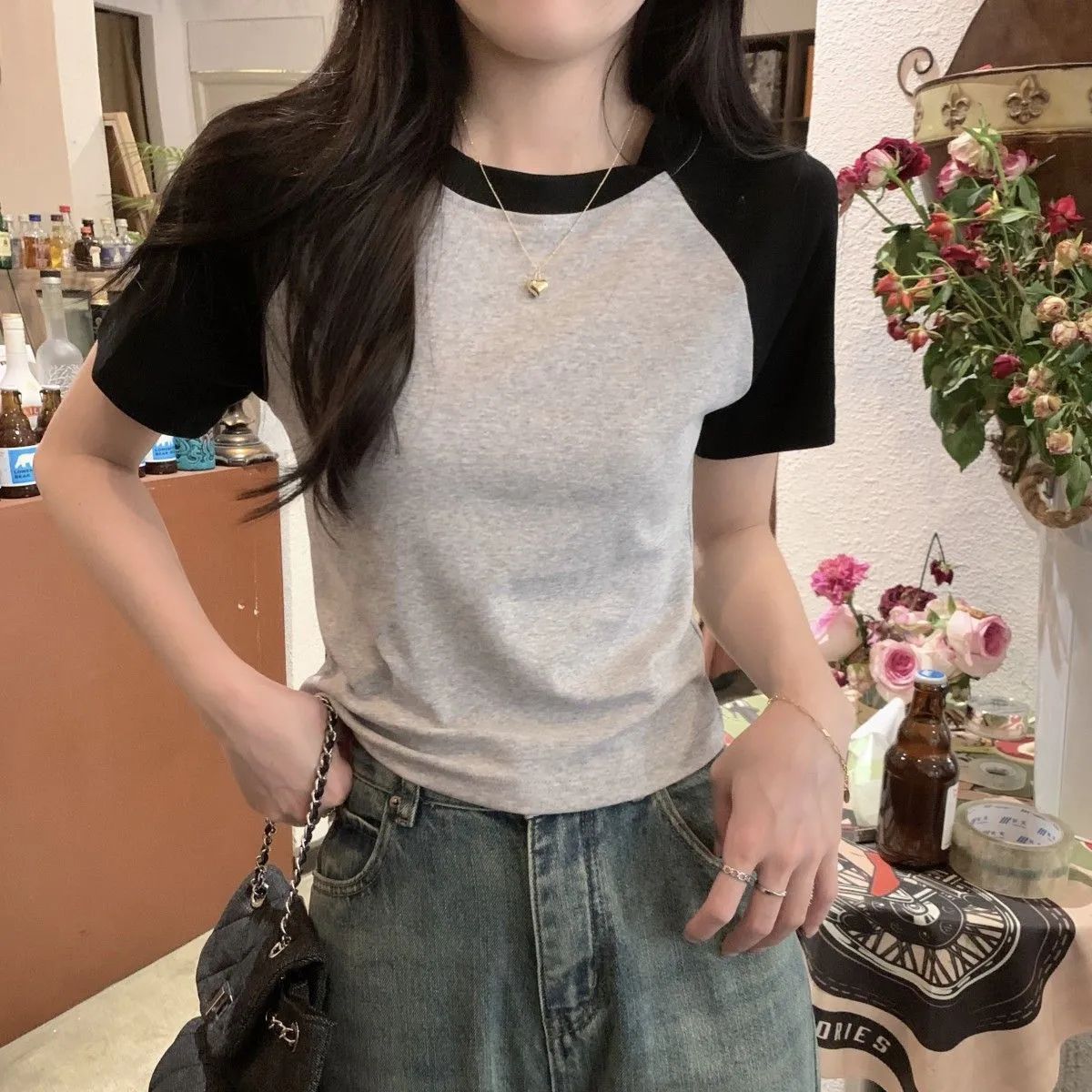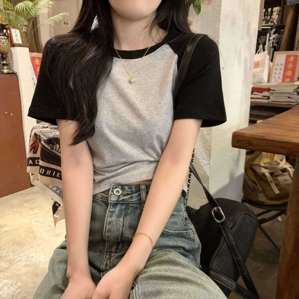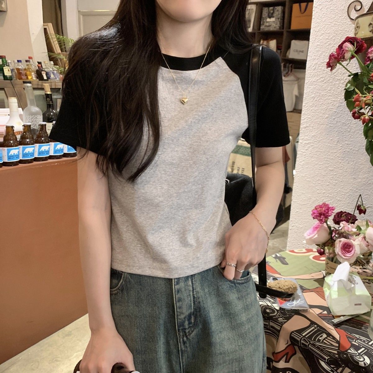 新款拼接撞色短袖t恤女夏季修身显瘦设计感气质休闲百搭上衣