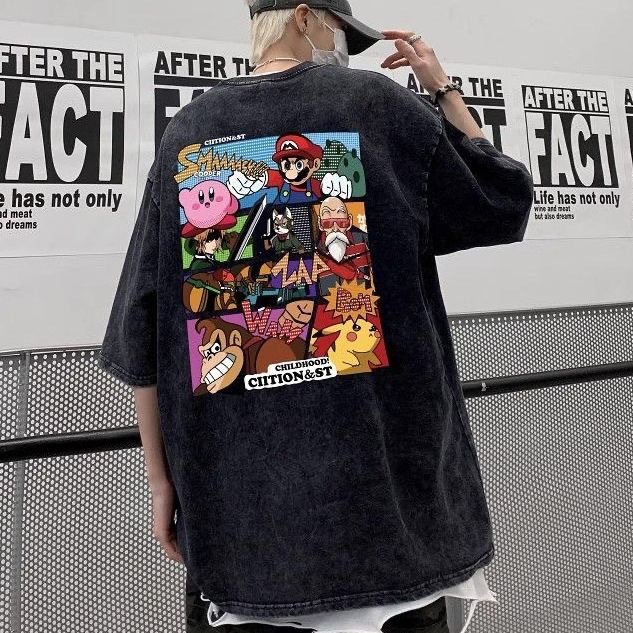 日系动漫卡通水洗做旧短袖T恤男女纯棉重磅高街潮牌潮流五分袖