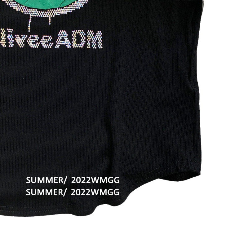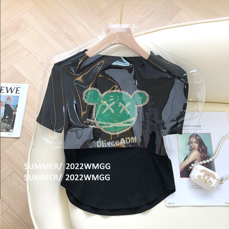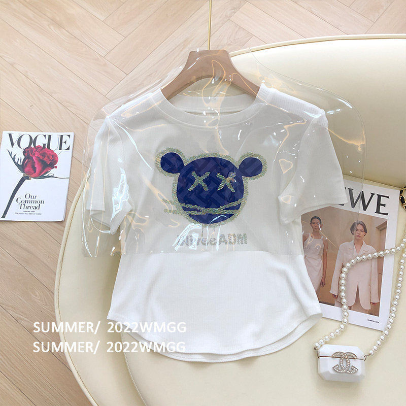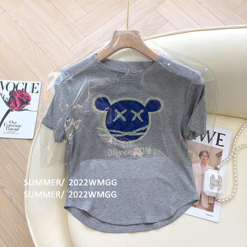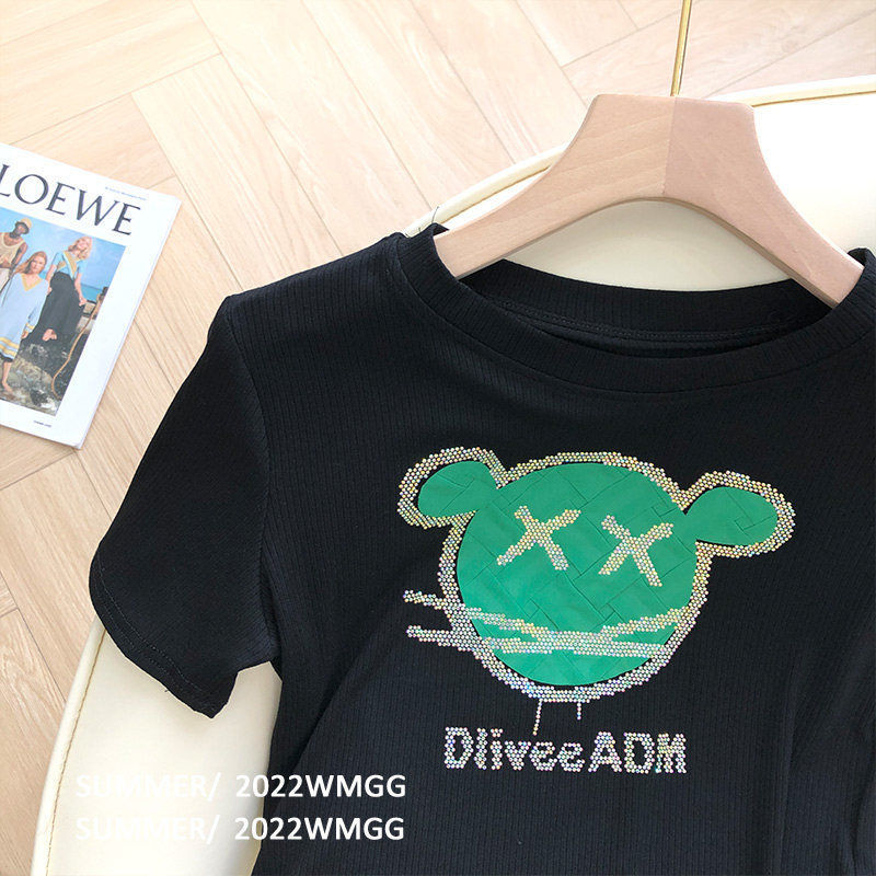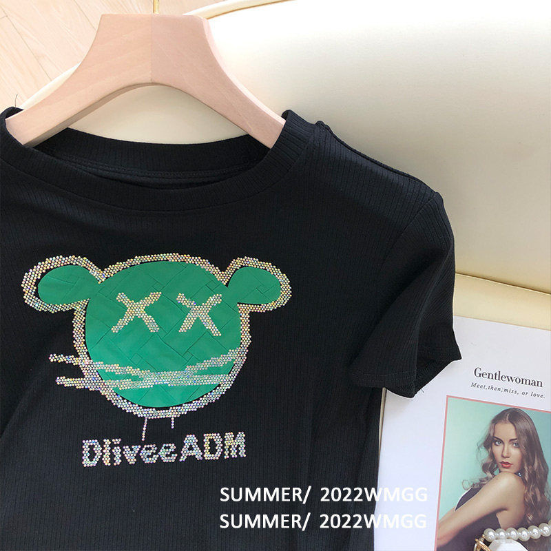 烫钻短袖t恤女夏季设计感小众小熊印花体恤韩版修身显瘦短款上衣