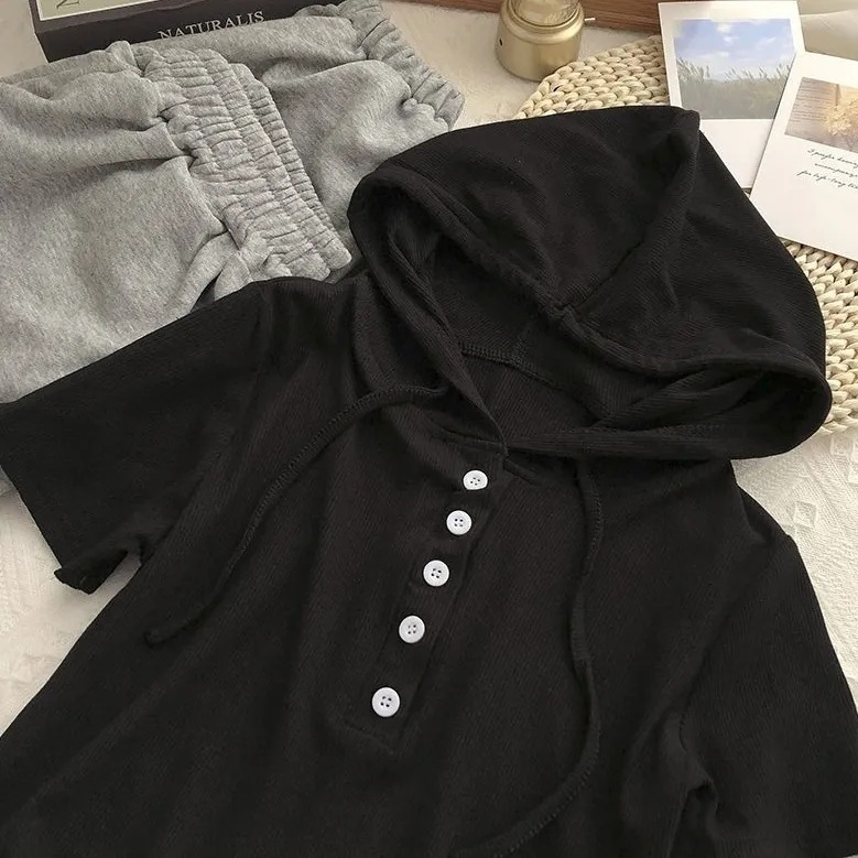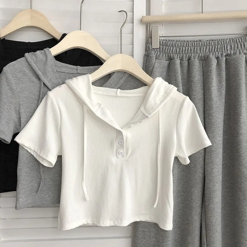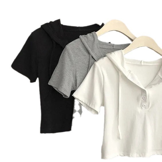 抽绳连帽短袖上衣女新款夏季韩版气质百搭显瘦短款T恤打底衫