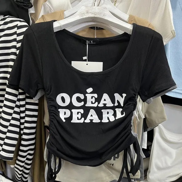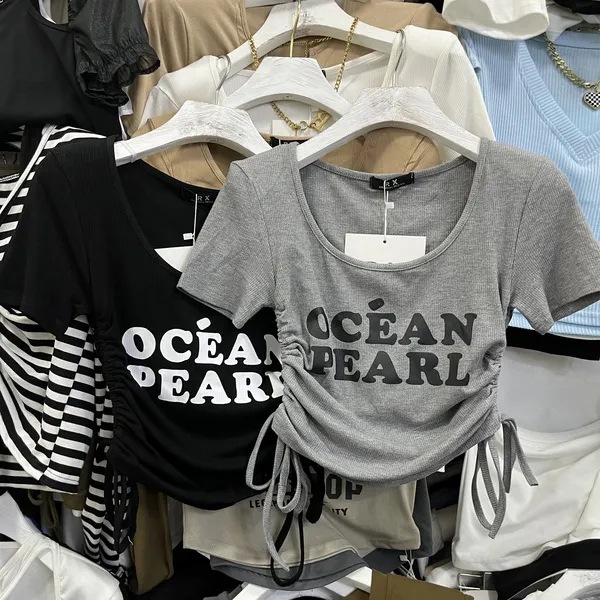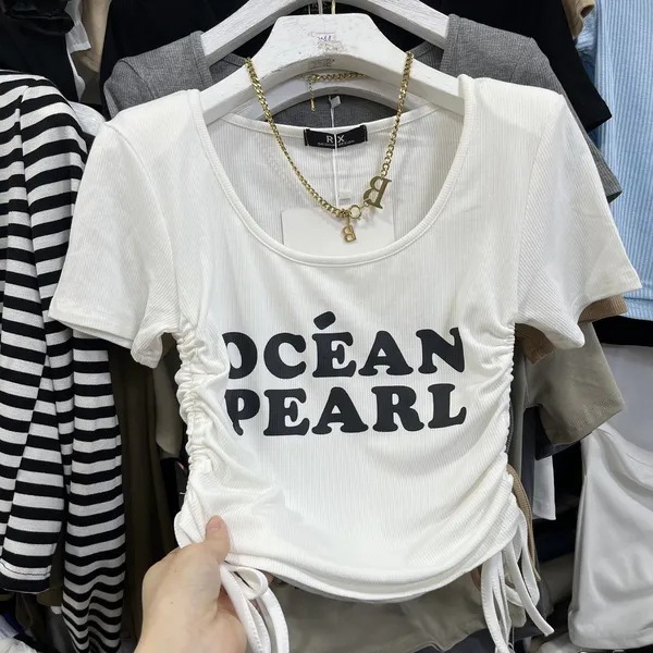 夏季新款韩版时尚显瘦圆领系带抽绳字母印花短袖套头T恤上衣