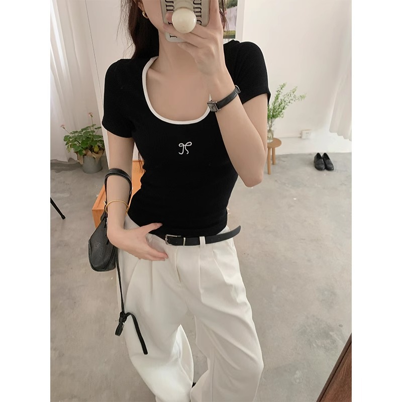 美式复古撞色短款U领弹力修身上衣蝴蝶结刺绣夏季短袖T恤女