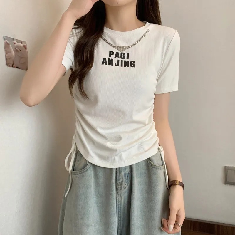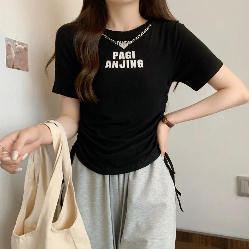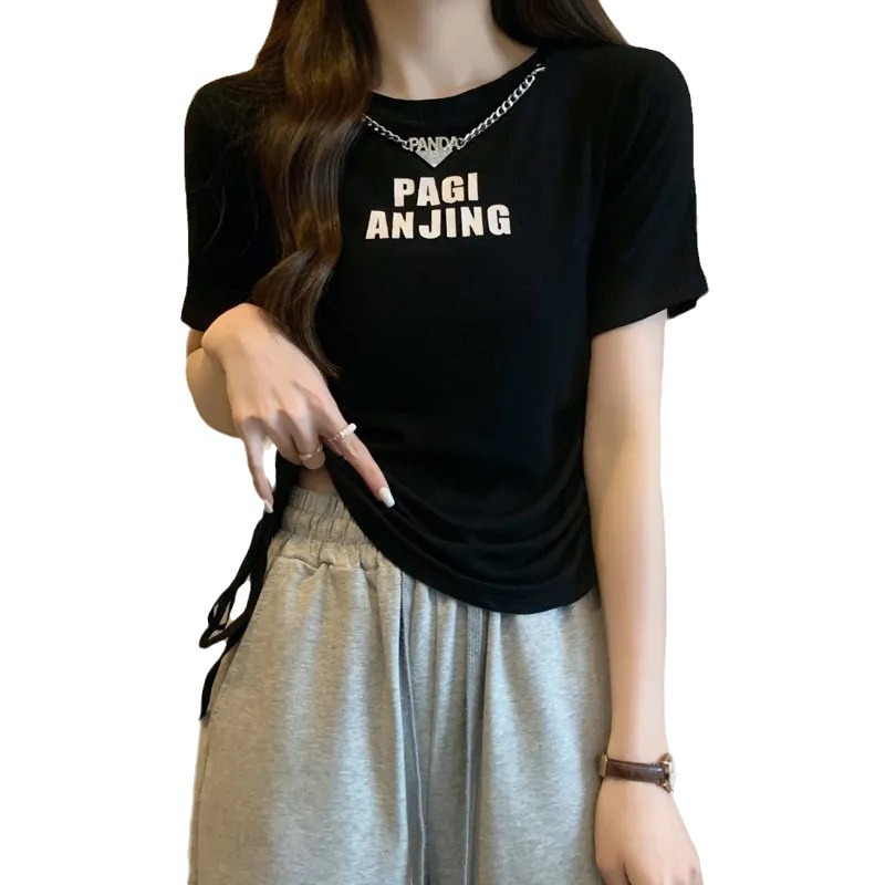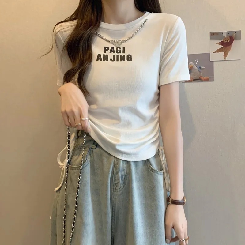 冰丝螺纹短袖T恤女夏季新款修身显瘦设计感小众双抽绳印花上衣潮.