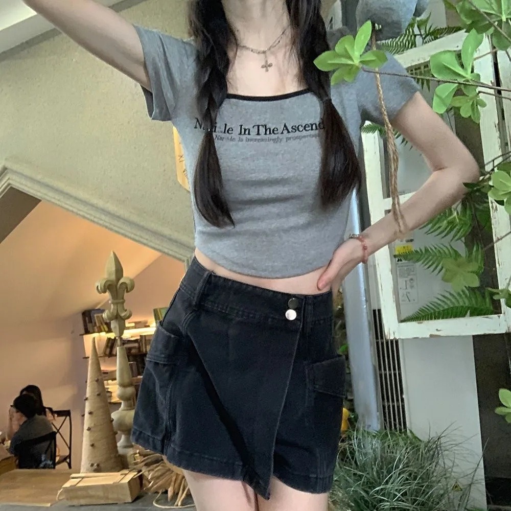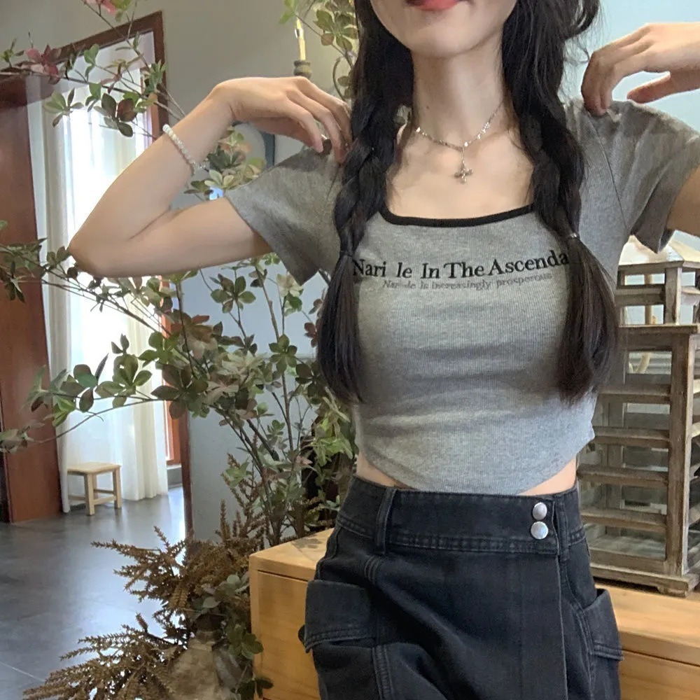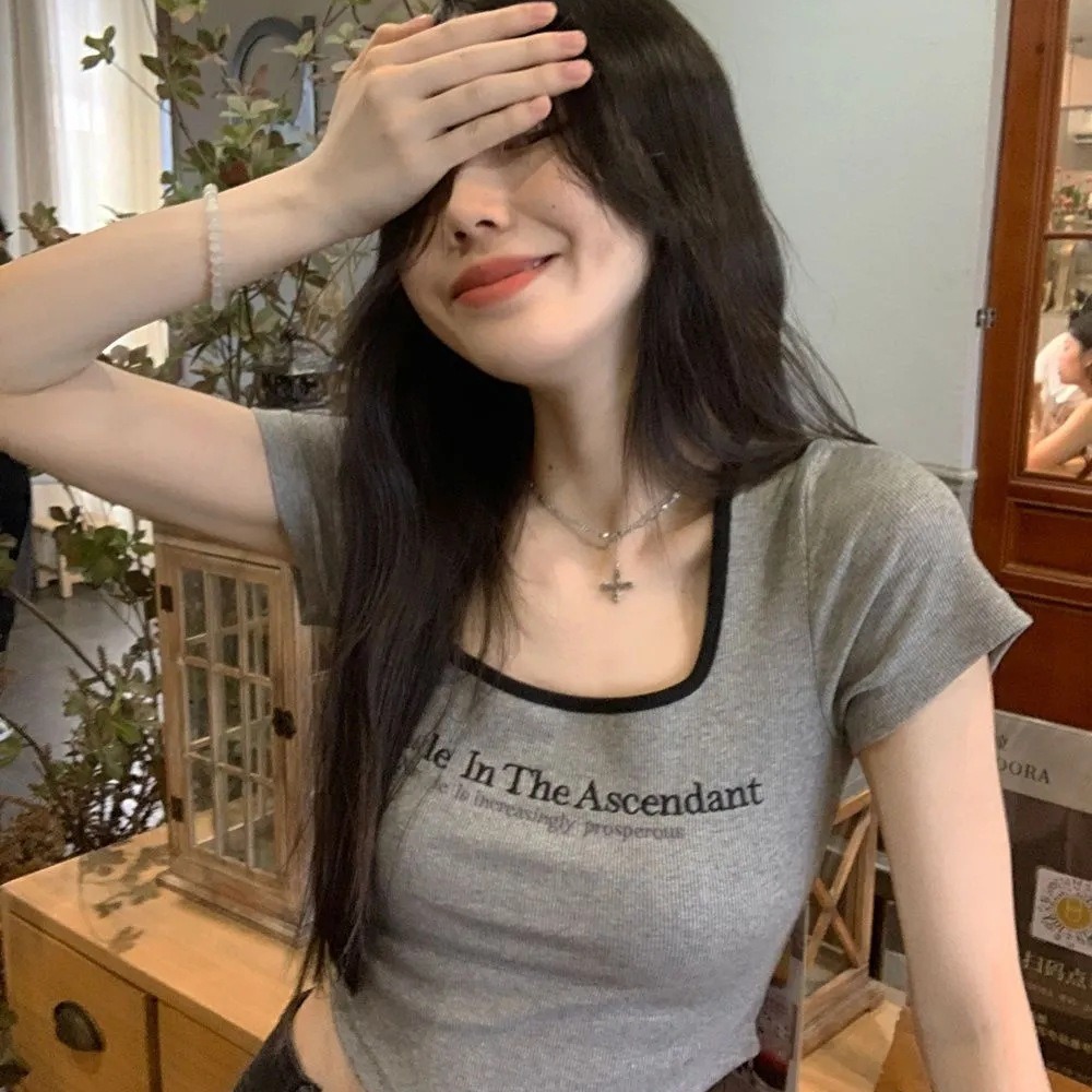 纯欲风辣妹高腰短款方领上衣女夏季新款小心机露脐短袖t恤潮