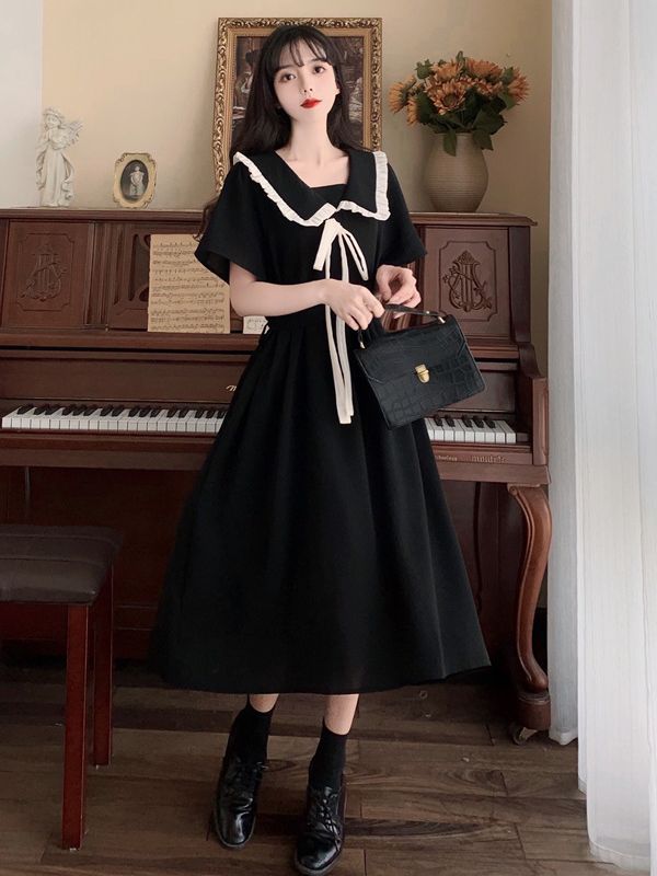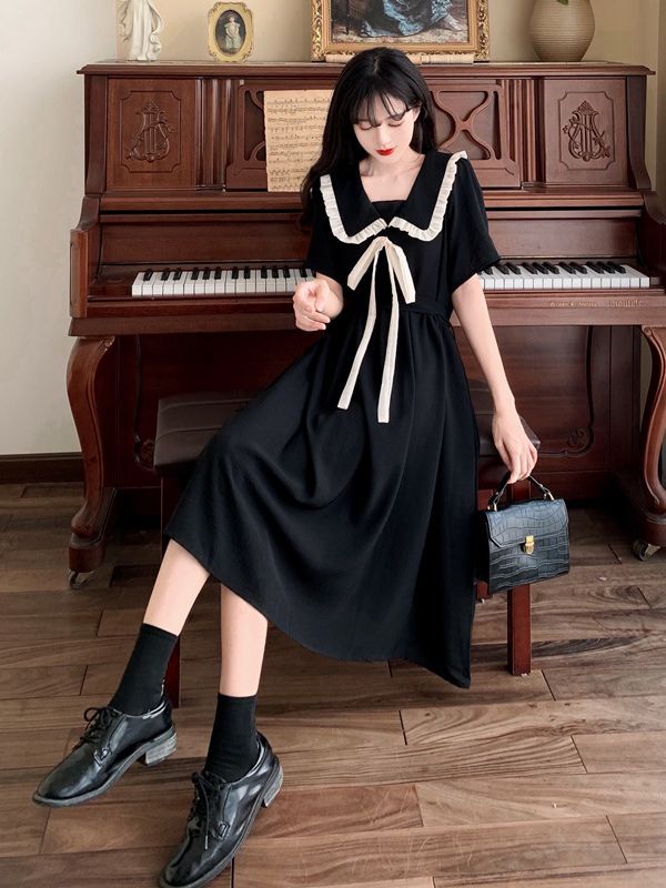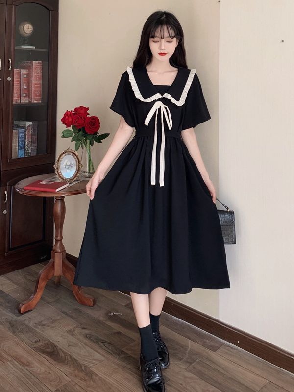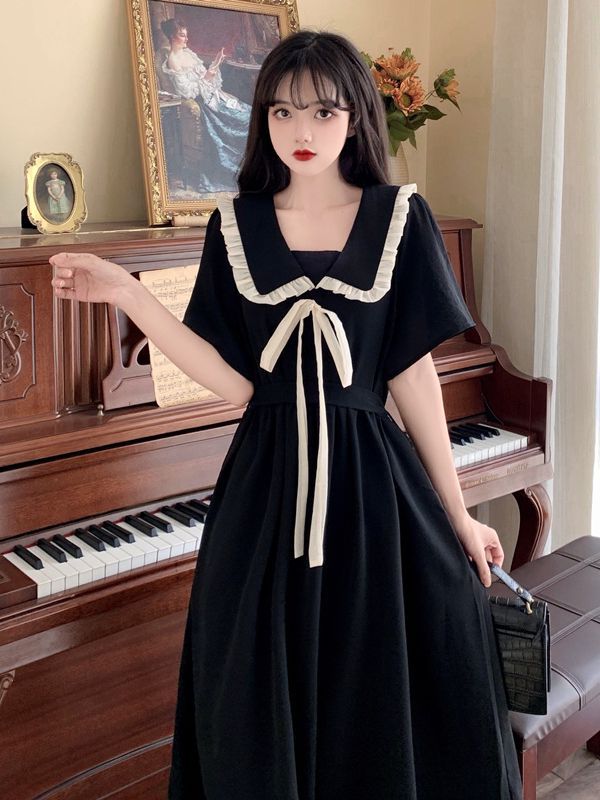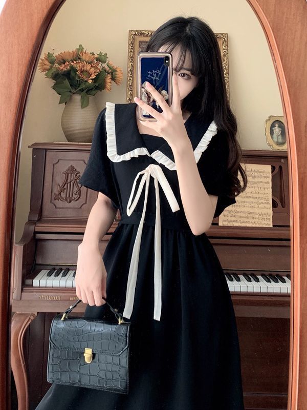 学院风减龄娃娃领蝴蝶结系带小黑裙子夏季大码学生少女短袖连衣裙