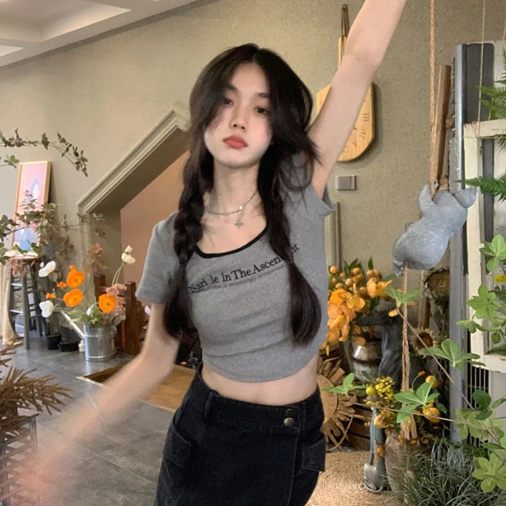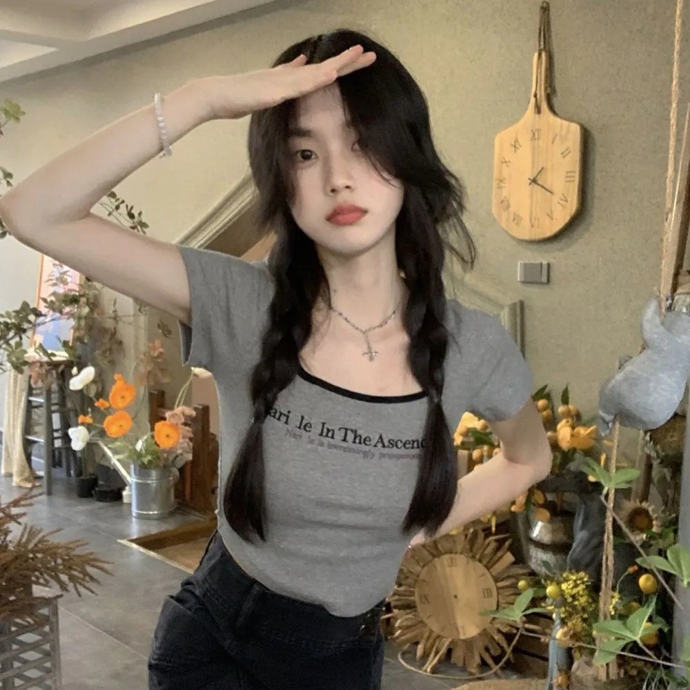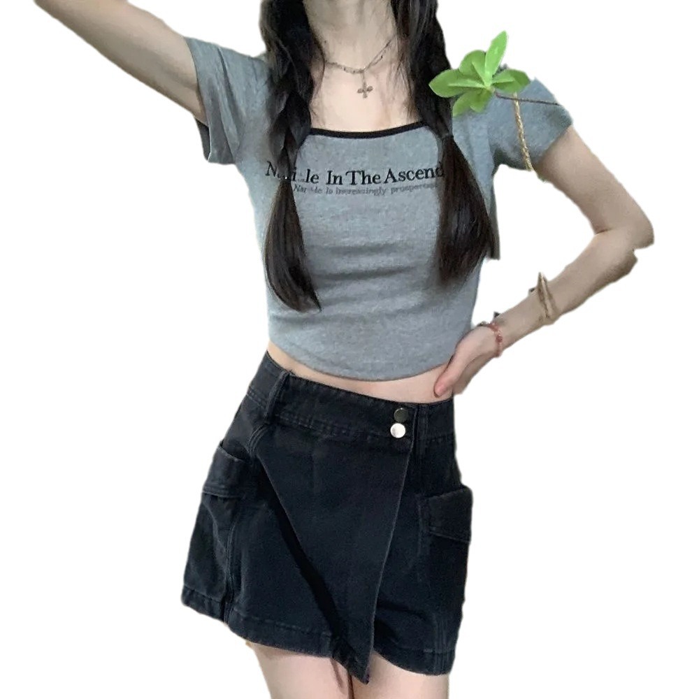 夏季韩版新款显瘦方领正肩短袖t恤女印花字母短款上衣纯欲bm韩风